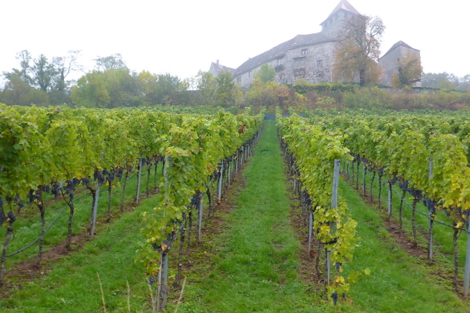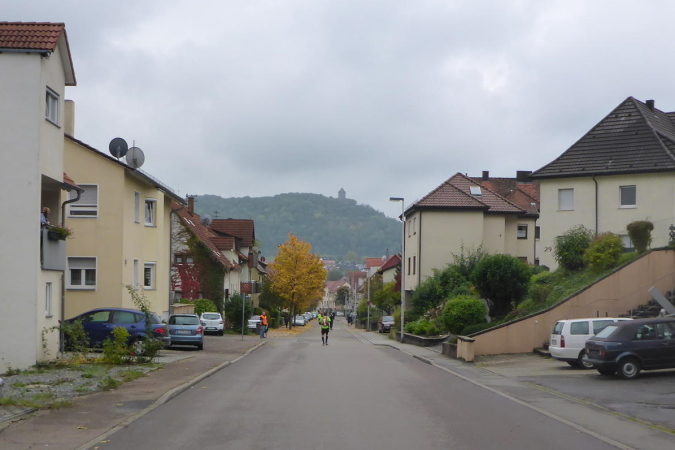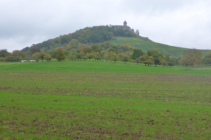 Etwas weiter gibt es erneut eine Weiche. Wir laufen geradeaus, während das Hauptfeld nach rechts geleitet wird. Hinter dem Wohngebiet geht es auf die Felder. Rechts hinter Büschen können wir das Flüsschen Bottwar erahnen und links vor uns liegt die Burg Lichtenberg. Auch von dieser Seite ist das Wahrzeichen des Bottwartals äußerst eindrucksvoll. Ich ahne, worauf es hinausläuft: müssen wir da noch einmal rauf?