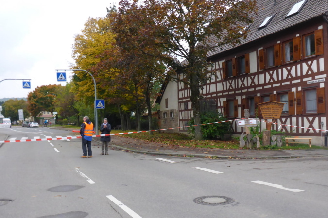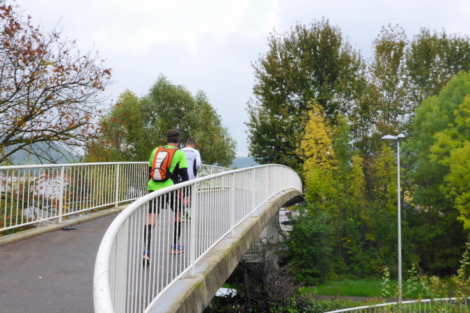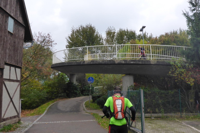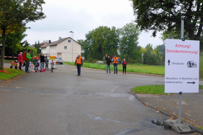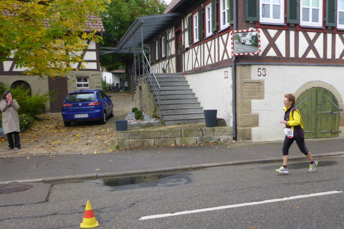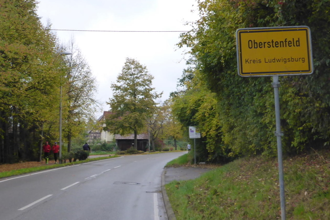 Hinter dem Parkplatz wird vor der Unterführung auf eine Streckenteilung hingewiesen. Ultras gehen nach links, während die anderen nach rechts eine Schleife über Beilstein laufen. Da haben wir mal kurz 4 km gespart. Es geht nach Oberstenfeld zurück, auf der lange Beilsteiner Straße Richtung Ortsmitte. Die Percussion-Gruppe an der Ecke war letztes Jahr auch schon da. Ihr Rhythmus lässt die Beine fast von alleine laufen. Fachwerkhäuser säumen den Weg. Ein Sprecher macht Stimmung und sagt jeden Läufer namentlich an. Vor allem Ultras werden mit lautem Hallo begrüßt. Die Strecke führt nun links in ruhigere Gassen. Ein Fußweg bringt uns zum Übergang über die L1100. Es geht in einem Kreisel hinauf, dann über die Brücke und in einem weiteren Kreisel wieder hinab.