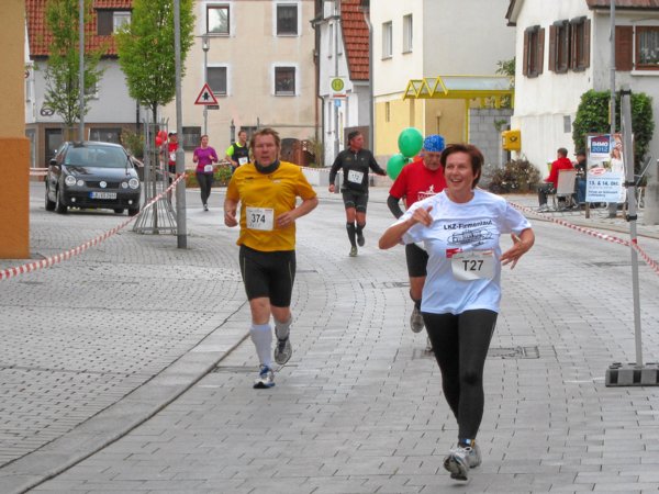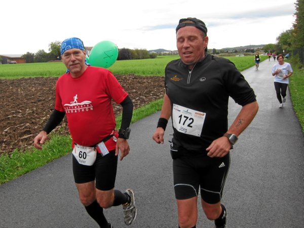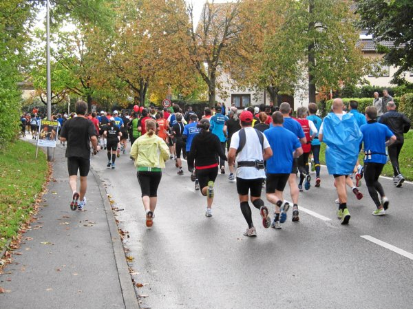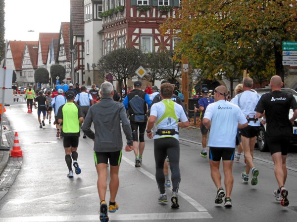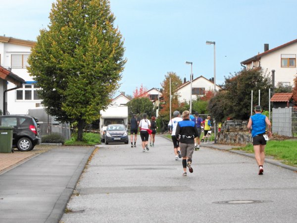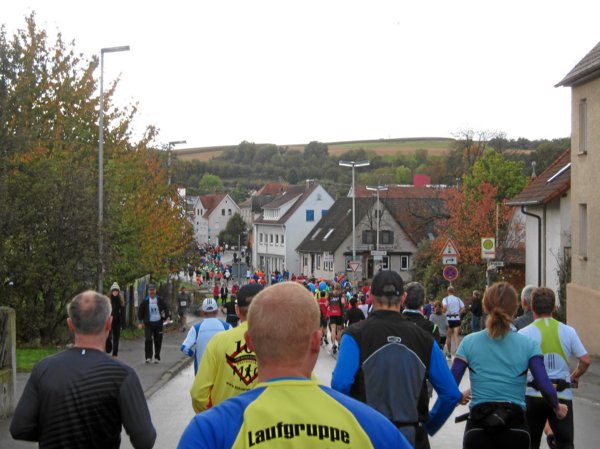 Plötzlich zischten zwei Läufer an mir vorbei, die sich auf meine Frage hin als 30km-Läufer outeten. Kurz danach überholte mich wieder einer in rasantem Tempo: „Nicht wundern, man hat uns nach dem Start fehlgeleitet!“ rief er mir im Vorbeilaufen zu. Am Ortsausgang wurde er nach links gelenkt, wieder Richtung Süden und ich nach rechts, weiter nach Norden hoch. Vermutlich hatte man die Dreiviertler versehentlich auf die Südschleife geschickt und mit den ab Hof und Lemberg noch etwa 7 Kilometern zurück bis Steinheim wären das etwa 24-25 Kilometer gesamt. Ärgerlich.