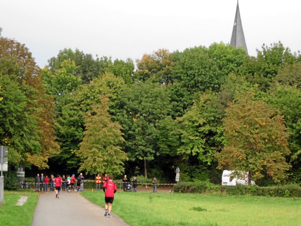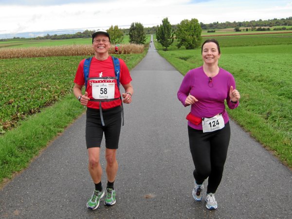Die nächsten 3,5 Kilometer waren Begegnungsstrecke, aber die Startzeiten waren so, dass uns da niemand begegnen konnte – schade. Lediglich Nicole sah ich am Straßenrad stehen und auf die 30km-Läufer warten, die eigentlich längst vorbei gekommen sein müssten. Ist da was schief gelaufen?