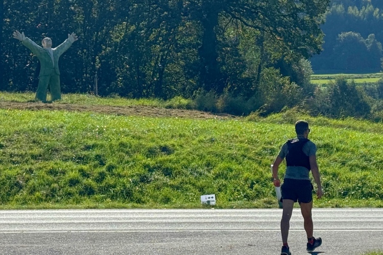Flach wird es heute eigentlich nie werden. Ziemlich genau bei km 9 der nächste VP, diesmal bei der Regnitztaler Alm. Nun kann ich auch beim Bier nicht nein sagen. Aber nur ganz wenig. Ein Stück auf dem Radweg an der Staatsstraße, dann folgt ein Waldstück, letztendlich werden wir nun auf sieben Kilometern viel Grün sehen, leicht bergauf auf dem Forstweg. Wir sind im Hauptsmoorwald, einem Kiefernwaldgebiet, das bis 2014 von den US-Streitkräften genutzt wurde. Ein Marterl erinnert an die heiliggesprochene Kaiserin Kunigunde von Luxemburg, die hier um die erste Jahrtausendwende mit Kaiser Heinrich II unterwegs war.