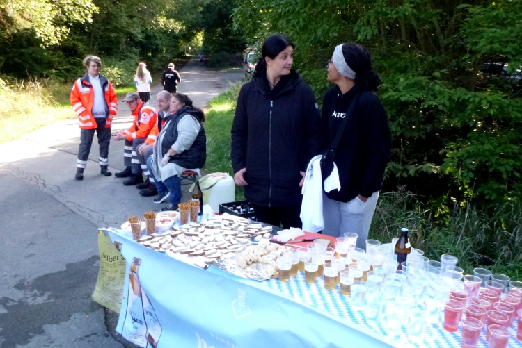 Ein Ziel habe ich vor Augen: allen kulinarischen Ablenkungen zum Trotz unter 5 Stunden zu bleiben. In Strullendorf wird ein Weg zu den Duschen in einer Schule gewiesen. Aber wir sind noch nicht so weit. Vor dem Rathaus wird gerade eine Hochzeit gefeiert. Wir biegen in die nette Lindenallee und erreichen den letzten VP bei Kilometer 40. Da geht die Post ab. Wir fassen uns kurz. Bier in Kölschglasmengen kann man quasi im Vorbeilaufen runterspülen. Die Brennerei Motzelhof, gleich nebenan, schenkt nichts aus, was Autofahrern nur recht sein dürfte.
