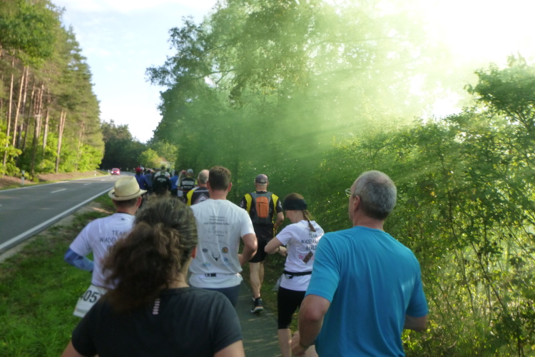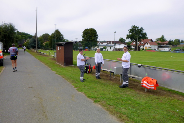 Dann ab km 36 eine Variante: ein kurzes Stück auf einem Trampelpfad. In Amlingstadt können wir am Gasthaus Schiller wieder unseren Flüssigkeitsverlust ausgleichen. Der Schwanenkeller wird nur tangiert. Die A73-Talbrücke wird nun auf der anderen Talseite unterquert. Der Felsenkeller ist auch geschlossen. Harald, ein nicht weit von hier ansässiger Oberfranke, hat sich zu Judith und mir hinzugesellt. Wir kennen ihn als Pacer von einigen Marathons. In zwei Wochen sehen wir uns in München.