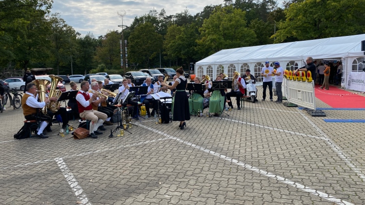 Mir fällt wieder einmal auf, wie gepflegt die Ortschaften hier sind. Unser Ministerpräsident, ein gebürtiger Franke, scheint seine Heimat nicht zu vergessen. Schwungvoll bergab. Wir sehen die Parkplatzwiese. Dann ist es nicht mehr weit. Holzschilder zählen die letzten Viertelkilometer herunter. Noch mal durch das Zelt. Wir werden von der Trachtenkapelle mit einem kräftigen Tusch empfangen!