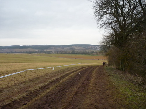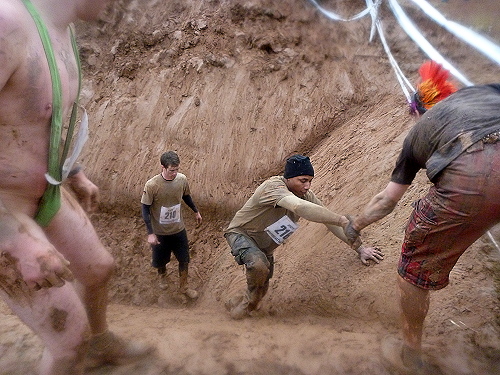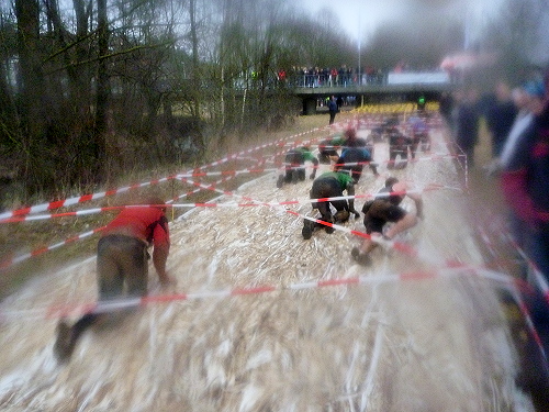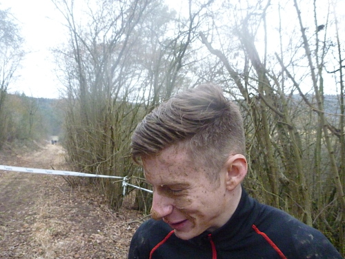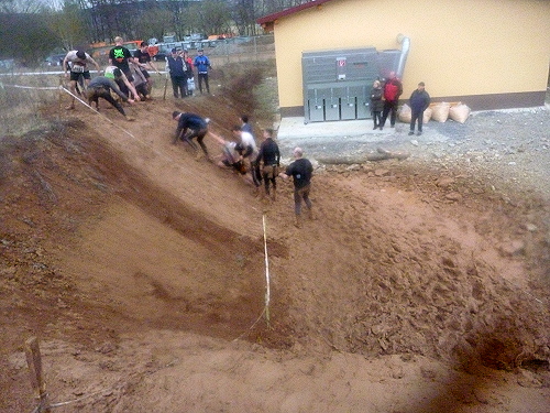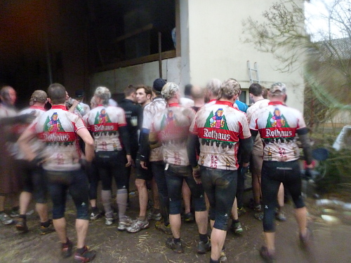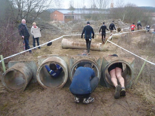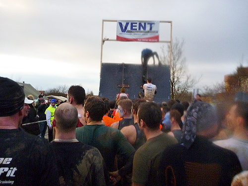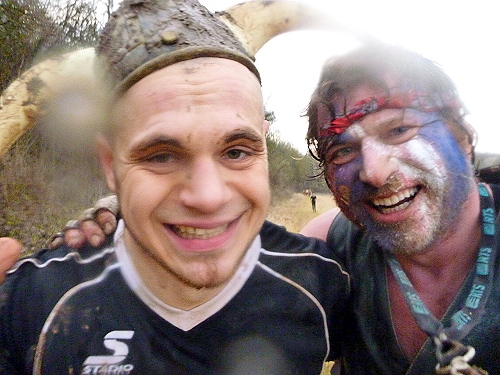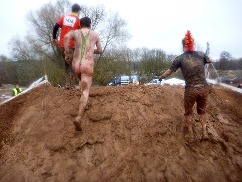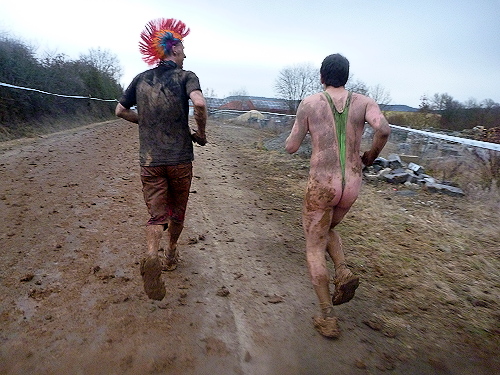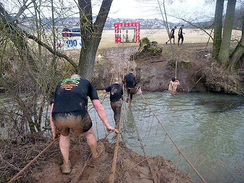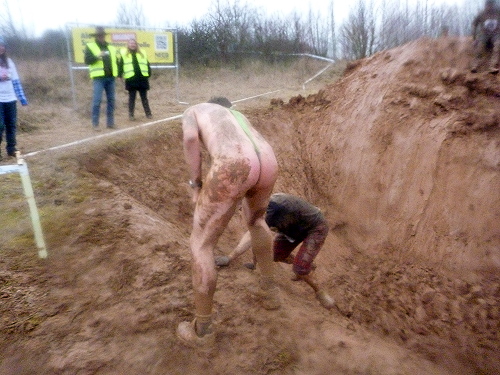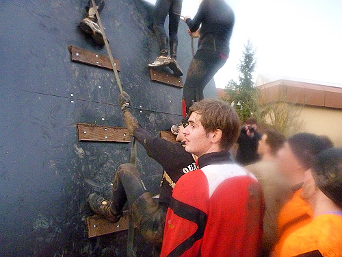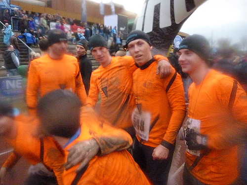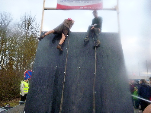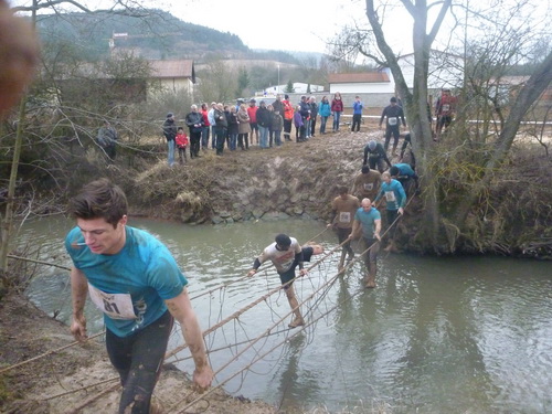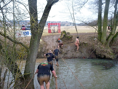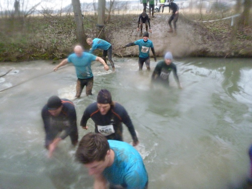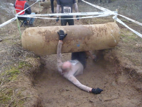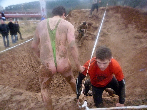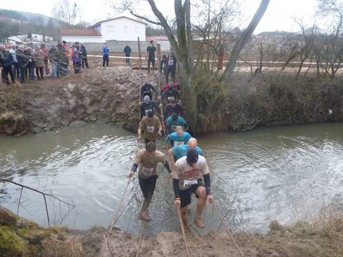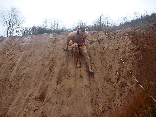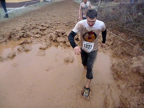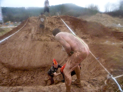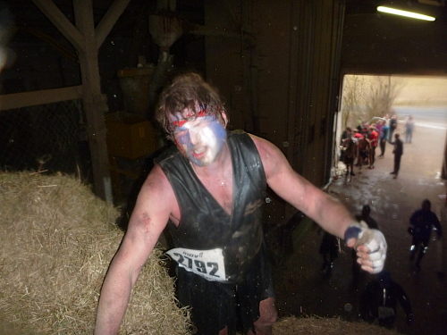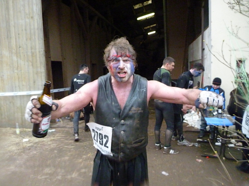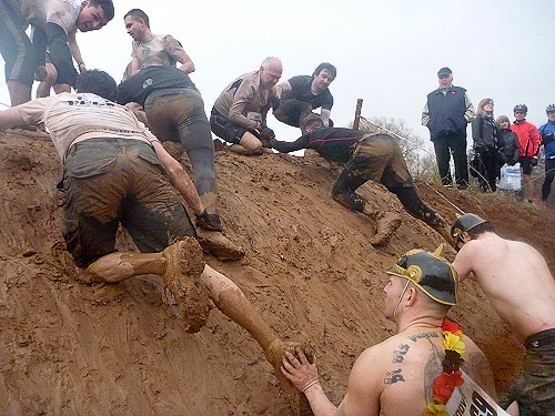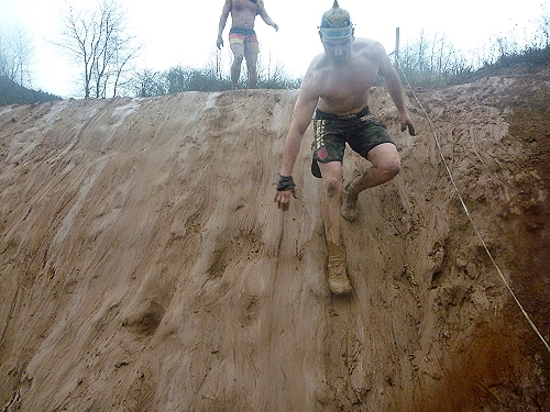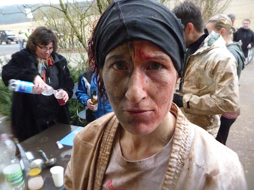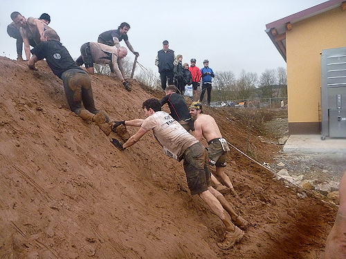 Der Weg führt nun eindeutig zurück, wilde Bergflanke. Münnerstadt, einen Namen den ich nie wieder vergessen werde. Blut Schweiss und Tränen. Dann folgt ein zweites „Death Valley“ mit der undurchdringlichen Dornenhecke „The Hedge“. Die schon bekannten Hindernisse zurück möchte ich nicht mehr erwähnen. Vor allem nicht mein desaströser Kampf in den Schlammlöchern. Da war nämlich alles ziemlich abgetrocknet, als ich ankam. Und trockner Schlamm ist wie Kloßteig. Ich will nur noch ins Ziel. Ich bin sowas am Borat-Arsch und treffe meinen Aufpasser wieder. Wir liegen uns in dem Armen, die Drecksau die fiese. Hat noch nicht mal ein Bier in der Hand und ich sehe aus wie ein Blindwühle am Kanalausgang von St Pauli.