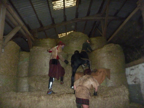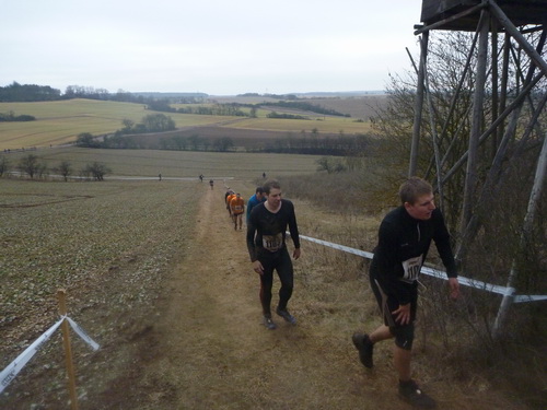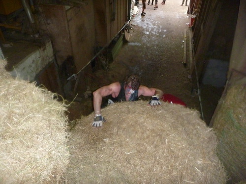Weiter querfeldein durch den Wald bis zur Münnerstädter Höhe . Hier oben erhalte ich den Rest. Frustrierende Kriech und Kletterhindernisse. Ich hab genug, ich bin fertig, ich kenn die Dinger vom letzten Jahr, aber es ist noch brutaler geworden! Man muss sich über die Strohballen drehen, Kopf runter, denn hier drüber ist der Maschendraht. Drehwurm, und rüber, über das nächste Hindernis. Es geht nix mehr. Und wieder Drehwurm durch die Strohballen-Duckdich-Dinger.