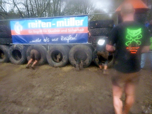 Dann kommt „Reifen-Müller-Castle“ mit überhohen Reifenwällen und dunkle, lange Röhren mit einschneidenen Felgenringen. Eine Reifenwand. Anlauf. Flatsch! Ich laufe frontal dagegen. Dumm, dass da eine Moderatorin war. Aber kein Zuschauer lacht mehr, die haben nur noch Mitleid. Das ist auch etwas, was ich mitnehme. Ich war letzes Jahr dabei, aber das war relativ einfach gegenüber heute. Hier und heute haben wir gekämpft und nach etwa 4 Kilometern echte Freunde fürs Leben gewonnen. Wir haben uns gegenseitig aus dem Dreck gezogen. Wir sind Platoons.