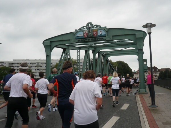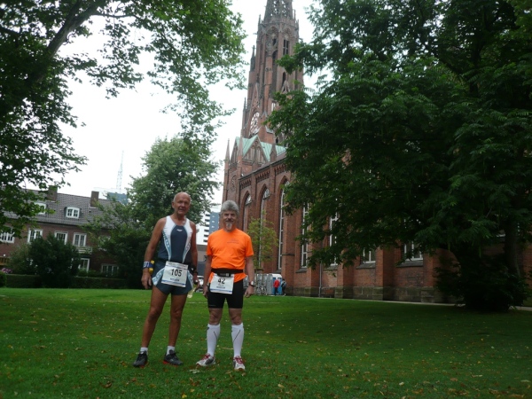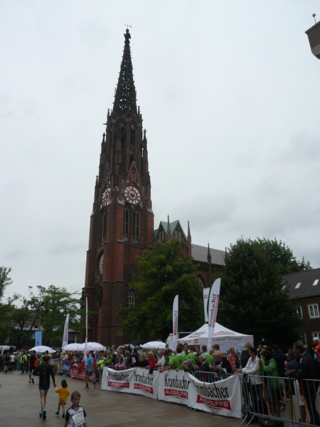 Schon um 7 Uhr ist im Gemeindehaus der Großen Kirche die Startunterlagenausgabe und die Möglichkeit der Nachmeldung für alle Strecken. Die Große Kirche, wie die Bremerhavener ihre Seefahrer Kirche nennen, wurde 1855 errichtet. Sie steht auf 552 Pfählen, die in den Boden des Marschlandes getrieben wurden. Nach dem Brand 1994 wurde die neue Kirche mit Hilfe von vielen Spendengeldern der Bremerhavener Bürger wieder neu und moderner errichtet. Das ungewöhnlichste an der Kirche ist der Name: Bürgermeister Smid Gedächtniskirche. Es ist die einzige Kirche in Deutschland, die einem weltlichen Bürgermeister gewidmet ist. Zu ihrer Einweihung am 22. April 1855 kam Bürgermeister Johann Smidt mit dem Dampfschiff aus Bremen angereist.
