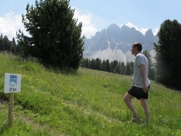 Die meisten Wege beim Brixen Dolomiten Marathon sind nicht steil. Aber in meiner Leistungsklasse kann man sie halt trotzdem nicht laufen. Daher kommen die Zeitunterschiede zu manch anderem Berglauf. Ab km 17 allerdings, wenn man oberhalb St. Jakob ins Aferer Tal kommt (1570 m), beginnen ca. 7 km purer Genusslauf mit kaum Höhendifferenz und nur harmlosen Steigungen. Schade nur, dass die Berge, Peitlerkofel und Geisler, nur schemenhaft zu sehen sind.