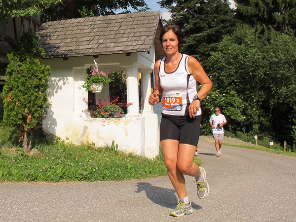 Hinterafers heißt die letzte Siedlung, danach verlassen wir die Passstraße bei km 25. Gleichzeitig hat das gemütliche Joggen ein Ende. 350 Höhenmeter sind auf 3 km zu bewältigen. Ich nenne diesen Abschnitt heute „Almblumen-Wanderung“. Zunächst ist kein Läufer in Sichtweite. Ich bin alleine und genieße es. Niemand treibt mich an, niemand bremst meinen langsamen Marsch noch mehr. Am Wegrand blüht es bunt, noch schöner sind die noch unberührten Wiesen. Die Stille ist fast vollkommen. Nur manchmal hört man von der Ferne den sonoren Klang einer Kuhglocke. Außer noch dem summenden Geräusch der Mücken ist nichts zu hören. Manchmal nehme ich mir zuhause auf meine Laufstrecke das Radio mit. Nie würde es mir aber einfallen, mich auf einem stundenlangen Lauf wie diesem mit Musik oder anderem von diesen Eindrücken abzulenken.