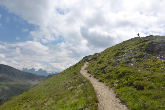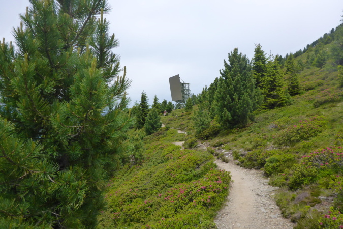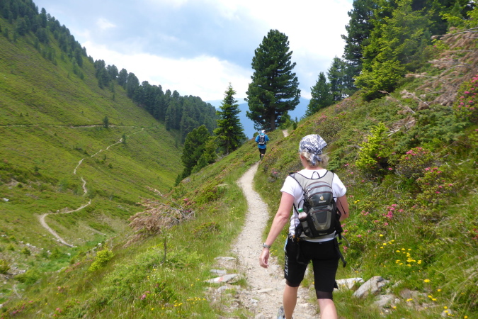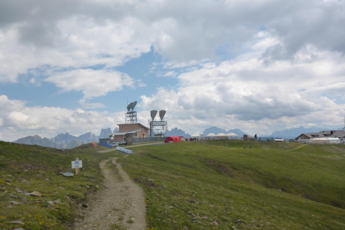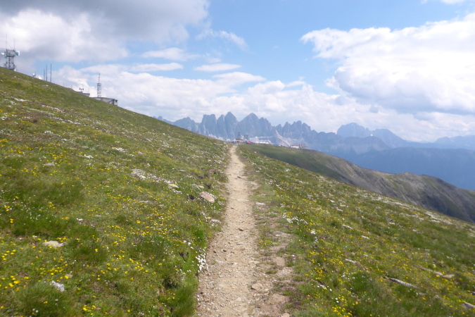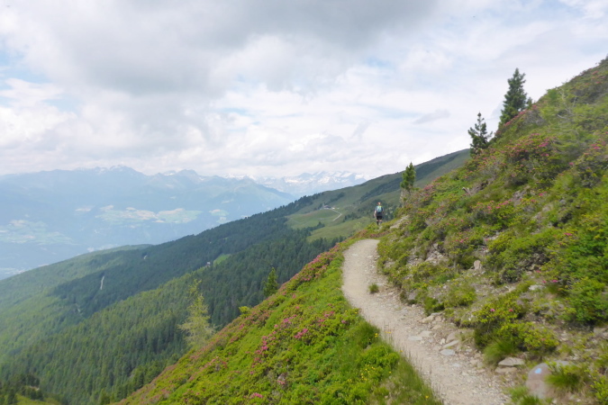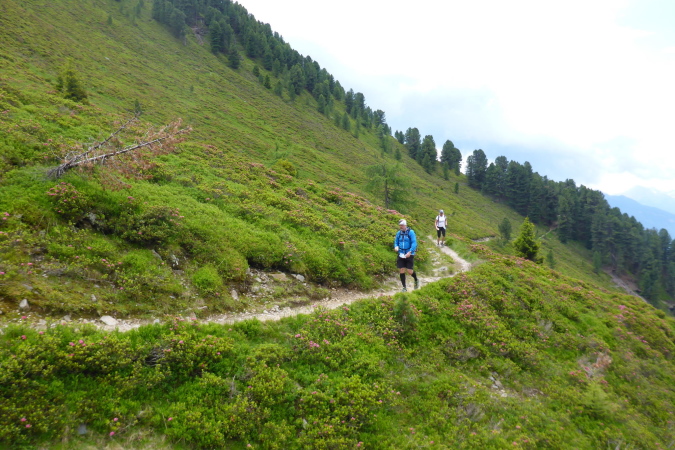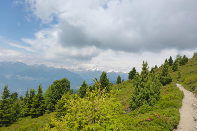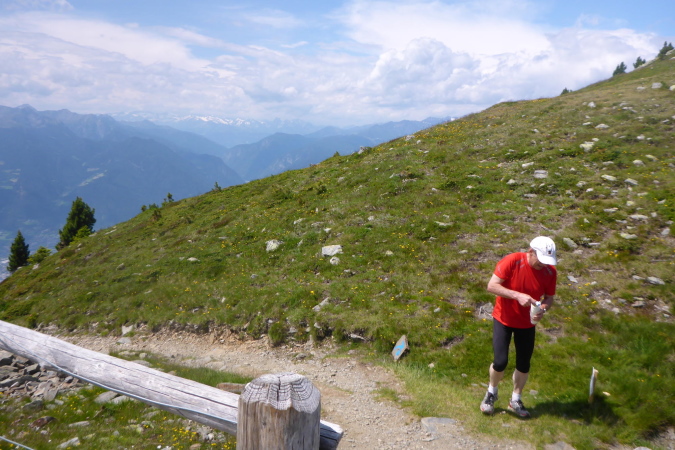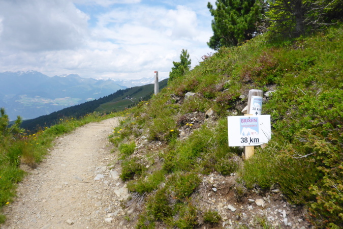 Die Läufer der Staffeln und die vom 33 km Lauf sind hier fertig und werden mit einem Shuttlebus abtransportiert. Für mich geht es weiter bergauf. Ein paar Wanderer helfen mir beim Wechseln des Akkus der Kamera. Während der breite Wanderweg weiter hinauf führt, zweigt die Laufstrecke auf einen Singletrail ab. Die Aussicht ist gigantisch. In der Ferne türmen sich schneebedeckte Gipfel und unter mir im Dunst liegt Brixen. Der Trail ist wider Erwarten gut zu laufen und geht tendenziell flach oder sogar bergab. Nanu, ich denke, wir müssen nach oben.