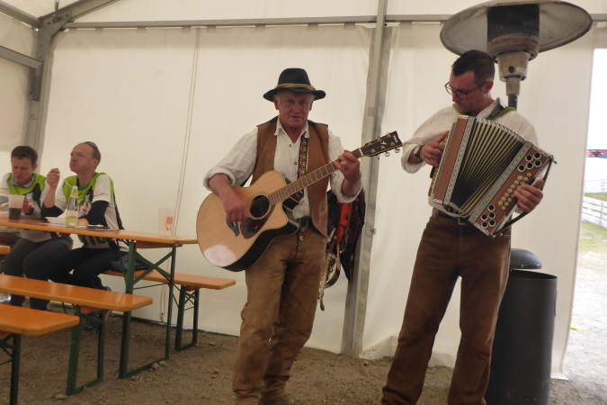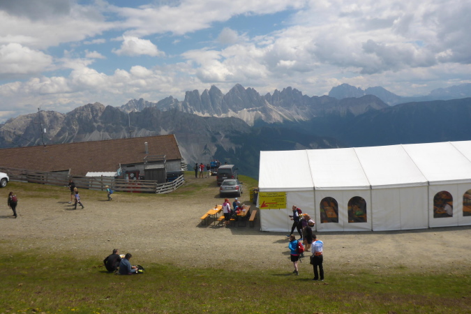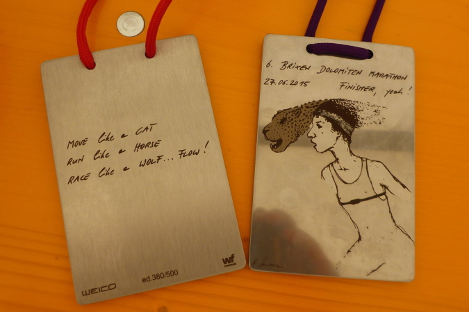Dann nimmt man mir den Chip ab und dafür bekomme die ungewöhnlich gestaltete, schwere Medaille aus Edelstahl. Auf das einmalige Finishershirt hatte ich mich besonders gefreut. Der Verpflegungsstand lockt mit Wassermelone, Äpfel und Tee. Ich habe mich unterwegs gut versorgt und bin deshalb nicht besonders hungrig oder durstig. Etwas unterhalb des Zielbereichs gibt es ein Festzelt in dem die Pasta Party stattfindet. Für die Nudeln hat jeder Läufer einen Gutschein bekommen. Getränke gehen auf eigene Rechnung. So verweilen wir auch etwas länger als nötig, das Zelt ist beheizt und es gibt sogar Livemusik. Gerade als wir in den Shuttlebus steigen wollen, fängt es an zu regnen. Während wir, zuerst mit dem Bus und dann mit der Seilbahn, ins Tal fahren, kommt schon das angekündigte Gewitter mit Blitz und Donner. Gerade nochmal Glück gehabt.