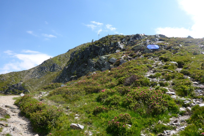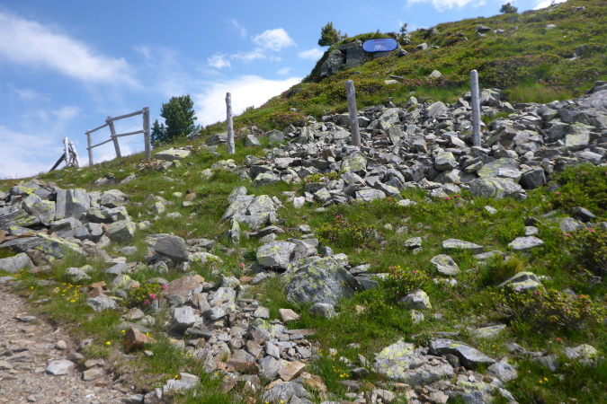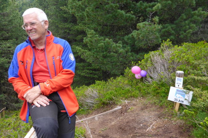 Vorerst einmal tiefenentspannt, jogge ich auf dem flachen, aber winzigen Trail entlang. Hinter einer Kurve erkenne ich, dass es nicht auf dem Grat, sondern unterhalb davon seitlich entlang geht. Das ist natürlich etwas ganz anderes. Die Personen oberhalb sind tatsächlich Streckenposten, die mich beim Näherkommen freundlich begrüßen. Wie, es kommt noch eine VP? Das Schild zeigt in 100 Metern, die aber steil nach oben gehen. Dort werde ich bereits erwartet. Die Helfer beglückwünschen mich. Wieso? Jetzt sehe ich es auch: Von nun an geht es nur noch flach, und die Zeit wird auf jeden Fall reichen. Ich bin so glücklich!