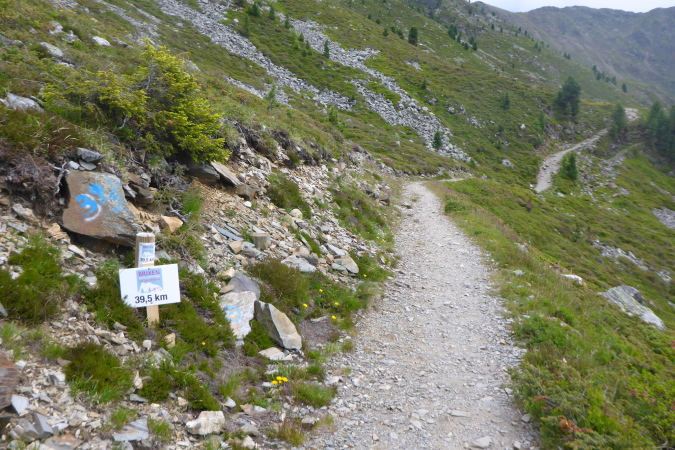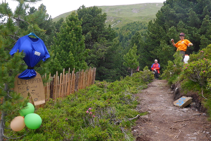 Das Läuten von Glöckchen weckt meine Aufmerksamkeit. Eine VP kommt in Sicht. Die Helfer vom SG Eisacktal haben eine witzige Laufpuppe gebastelt und begrüßen mich mit lauten Anfeuerungen. Ich erkundige mich, wann es endlich hoch geht. Es folgt eine für mich zu komplizierte Beschreibung des weiteren Wegs. Nur, dass man über einen Grat steil nach oben muss, kann ich heraushören. Na hoffentlich komme ich mit meiner Höhenangst da hoch. Zunächst geht es aber immer noch bergab.