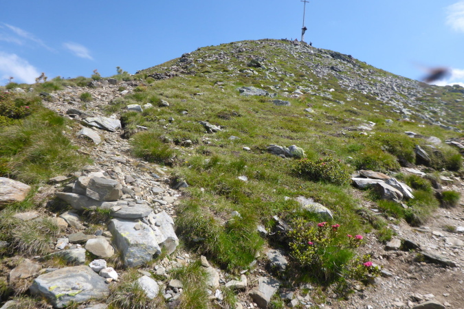 Das letzte Stück ist dann wirklich richtig steil. Dann bin ich oben. Freudig werde ich begrüßt: „Hallo Birgit, wir machen jetzt erst mal ein Foto.“ Der Helfer nimmt meine Kamera und wir suchen eine schöne Stelle für die Aufnahme. Dass ich mich auf einem so exponierten Platz extrem unwohl fühle, lasse ich mir dabei lieber nicht anmerken. Dann bekomme ich das Angebot Wasser oder Wein. Nein, kein Scherz, es gibt Rotwein. Das muss man mir nicht zweimal sagen. Dann lasse ich mich aufklären, wo es weiter geht und wo denn eigentlich das Ziel ist. Oh je, es geht wirklich auf einem Grat entlang und hinten nochmals hoch. Schon von weitem kann ich Personen hoch oben erkennen. Ob das mal gut geht? Die Helfer meinen, ich soll mir Zeit lassen. Der Besenläufer sei noch ganz unten.