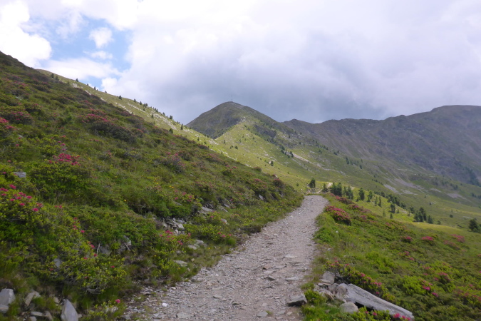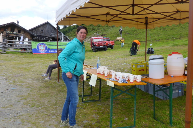 Die VP ist vor der Hütte der Ochsenalm aufgebaut. Ich sehe Bierflaschen. Sie sind alle leer. Schnell schickt die Helferin die Kinder, um frisches Bier zu holen. In Rekordzeit sind sie zurück. Das Bier ist kühl und schmeckt lecker. Die Helferin meint, eine Stunde braucht man für den Aufstieg zum Ziel. Auf meine Frage meint sie, das letzte Stück auf die Plose, sei richtig steil; sie würde sich das nicht zutrauen. Einerseits macht mir das Hoffnung, denn ich hab noch eine Stunde und 10 Minuten Zeit. Andererseits meldet sich bei der Aussicht auf einen steilen Anstieg meine Höhenangst. Aber umkehren ist nicht. Noch kann ich nicht erkennen, wo wir hin müssen; nur der Einstieg ist zu sehen.
