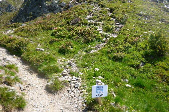 Wir überqueren nun einen kleinen Bach und ein Geröllfeld, bevor wir das km 30 Schild erreichen. Für die nächsten 3 Kilometer habe ich noch eine halbe Stunde Zeit, denn dort in Kreuztal ist der Cutoff mit 6 Stunden. Das müsste normalerweise reichen. Vor allem, weil das Gelände hier nicht übermäßig ansteigt. Ein Schild zeigt einen weiteren Bergpreis in 500 m an. Der Mann von Anja, einer Lauffreundin, wartet hier. Ob ich weiß, wo sie steckt, möchte er wissen. Sie müsste kurz hinter mir sein.
