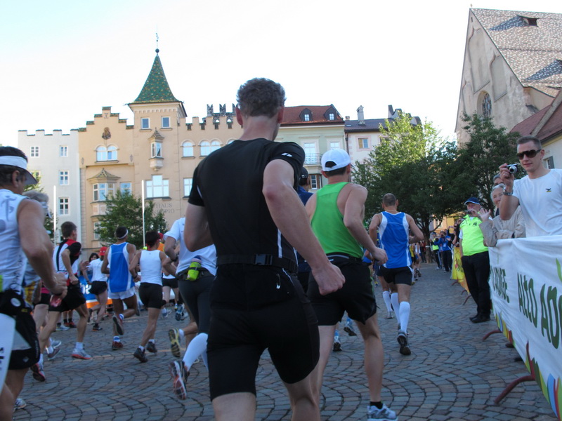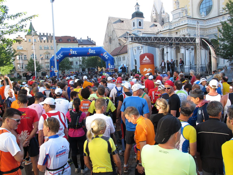 Der Marathon-Start ist in Brixen auf dem Domplatz, das Ziel ist auf der Plosehütte. Per Shuttle und Seilbahn kommt man zurück nach St. Andrä, das ungefähr in der Mitte zwischen dem Vista Hotel und Brixen liegt. Dorthin fahre ich am Sonntag in der Früh mit dem Auto, stelle es auf dem großen Parkplatz der Talstation ab und fahre mit dem Linienbus nach Brixen. Gut 30 Minuten vor dem Start bin ich dort. Natürlich gibt es auch in Brixen sehr schöne Hotels, aber für mich ist das abgelegene Quartier mal eine sehr willkommene Abwechslung.