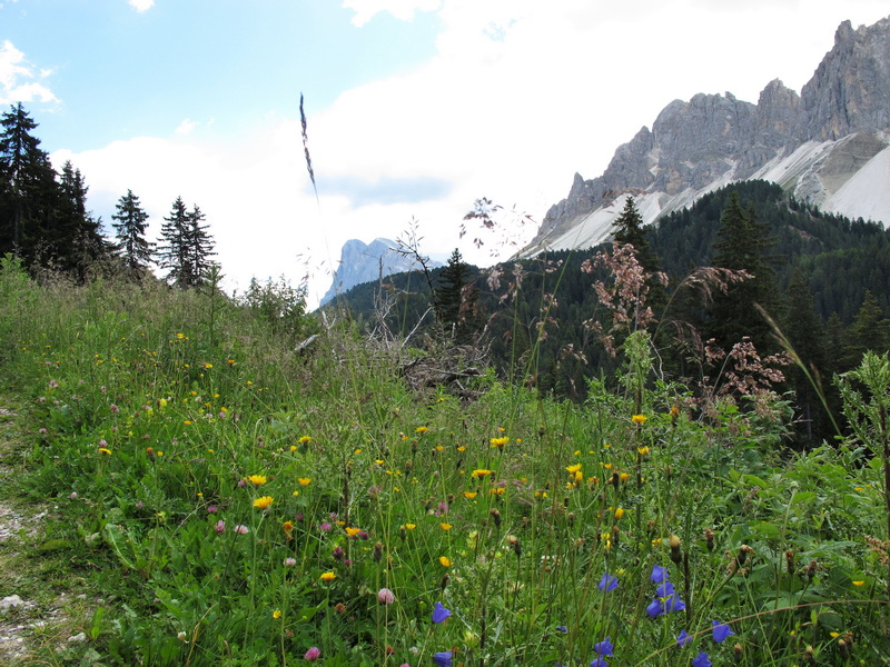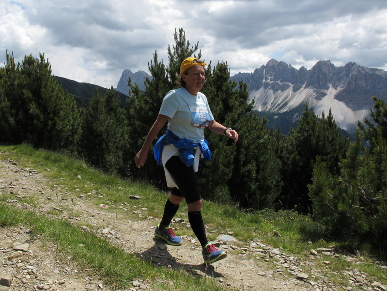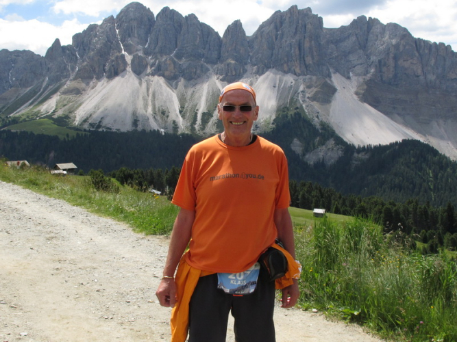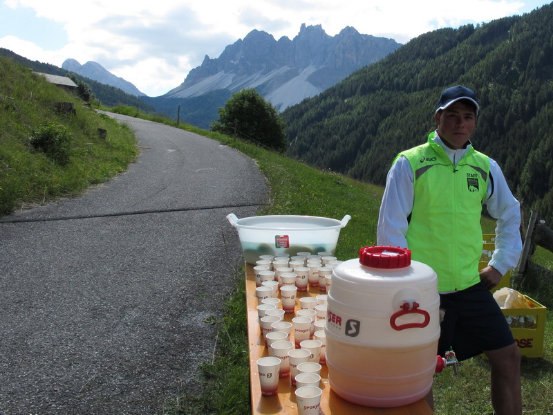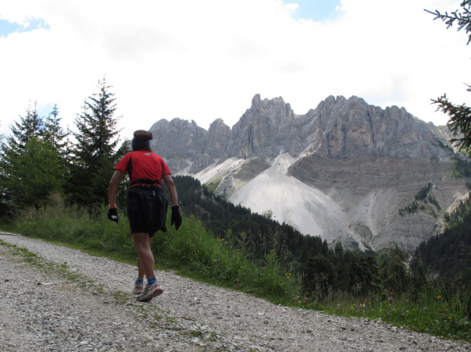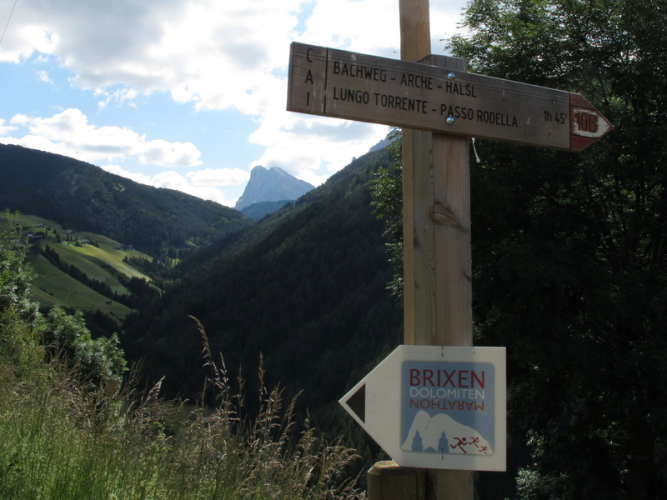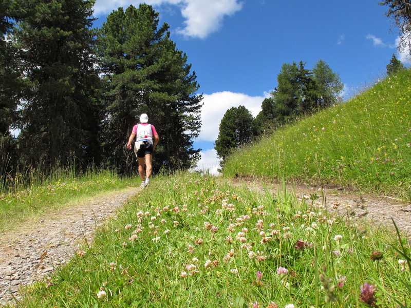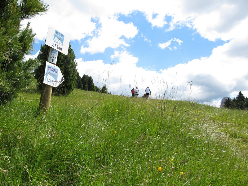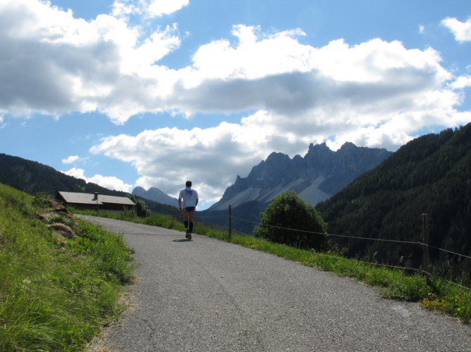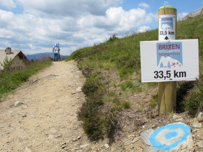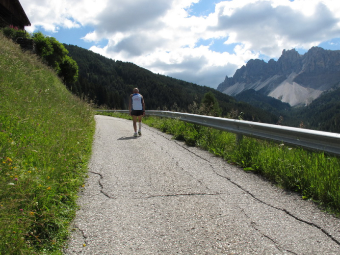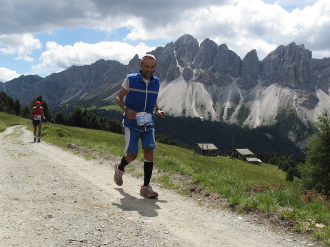 Wir verlassen die Passstraße bei der Verpflegungsstelle bei km 25 (1630 m). Iso, ein paar Kekse und weiter geht’s. 3 km und 350 HM wollen hinauf zur Peitlerknappen- und Schatzerhütte (1984 m) auf einen Rutsch genommen sein. Dann sind wir auf dem Panoramaweg, der uns auf einer Höhe zwischen 2000 und 1900 m westwärts zum Kreuztal bringt, der Bergstation der Plosebahn. Dazwischen liegen sechs wahrhaft traumhafte Kilometer durch herrlich blühende Almwiesen und mit atemberaubenden Ausblicken auf die irren Felsformationen der Geisler, die typisch sind für die Dolomiten. Aber auch die Langkofelgruppe kann man sehen, den Schlern und die Raschötz-Alm. Das Tal dazwischen ist daS Villnösstal, die Heimat von Reinhold Messner. Dahinter liegt das Grödner Tal, das der legendäre Luis Trenker bekannt gemacht hat.