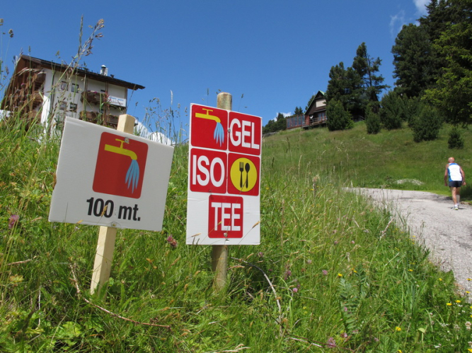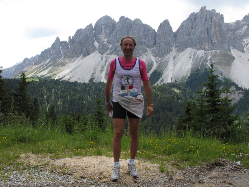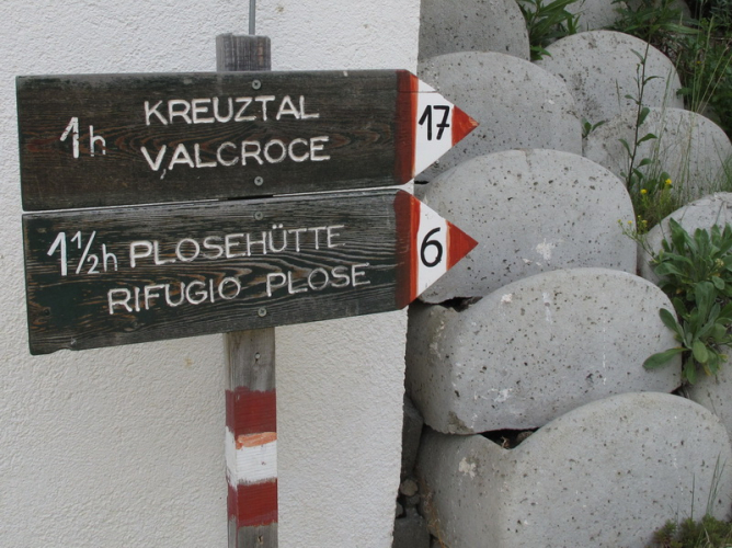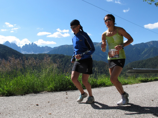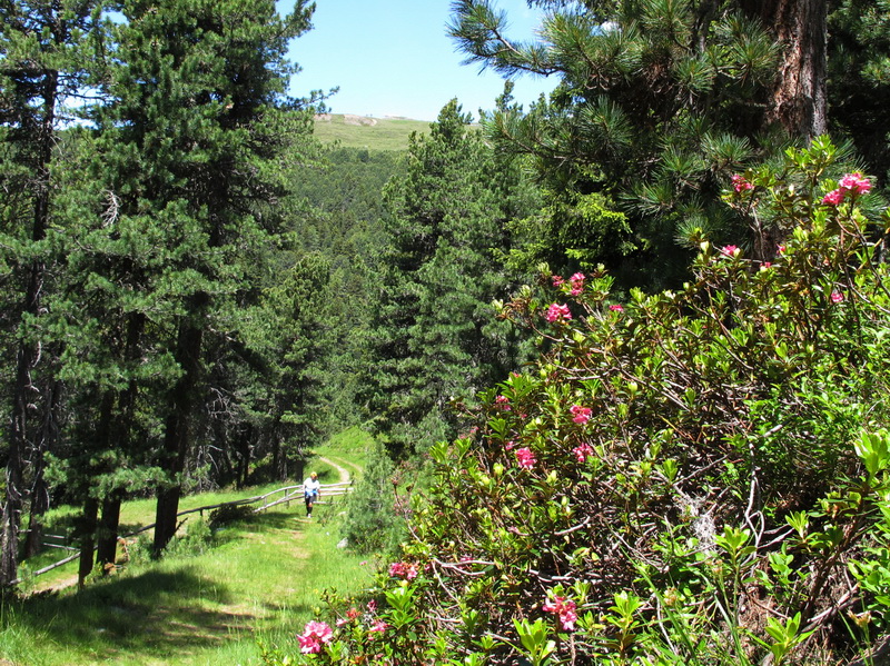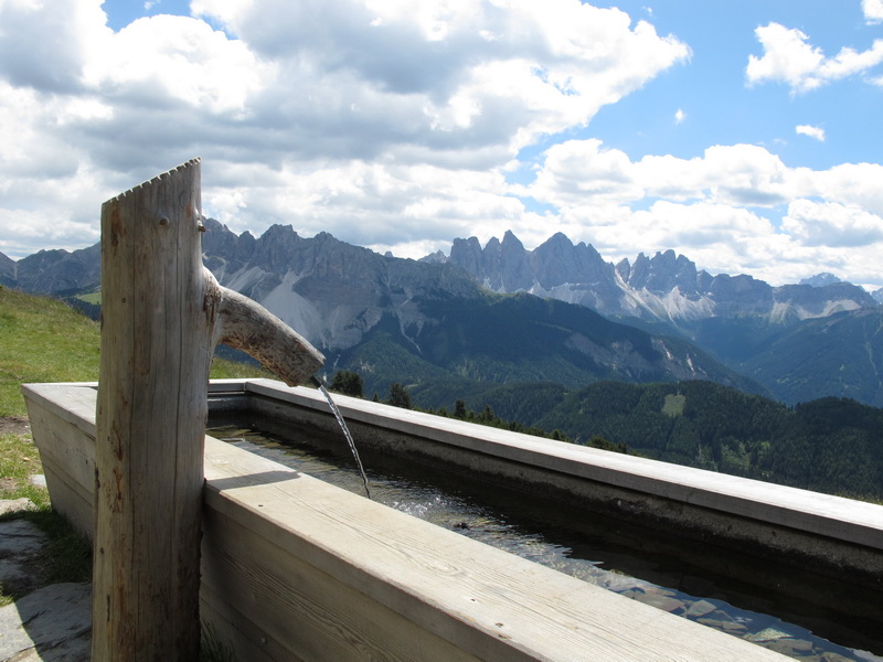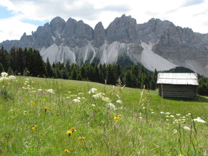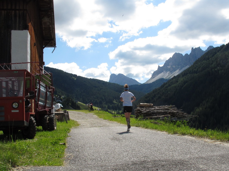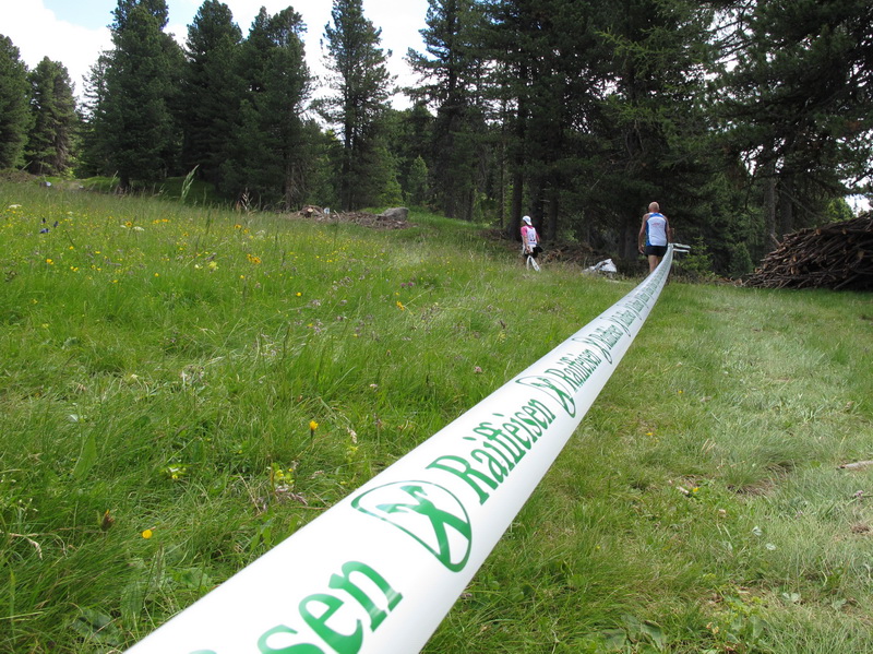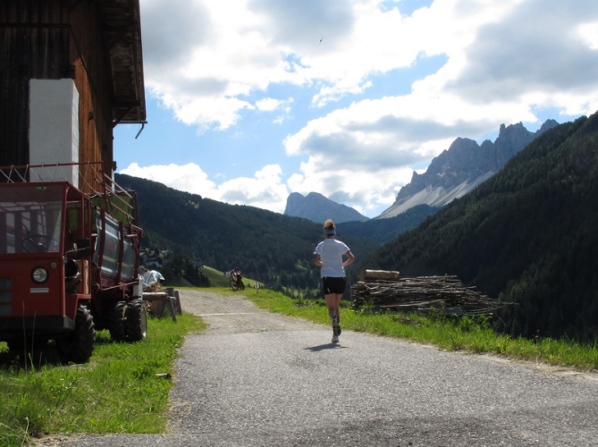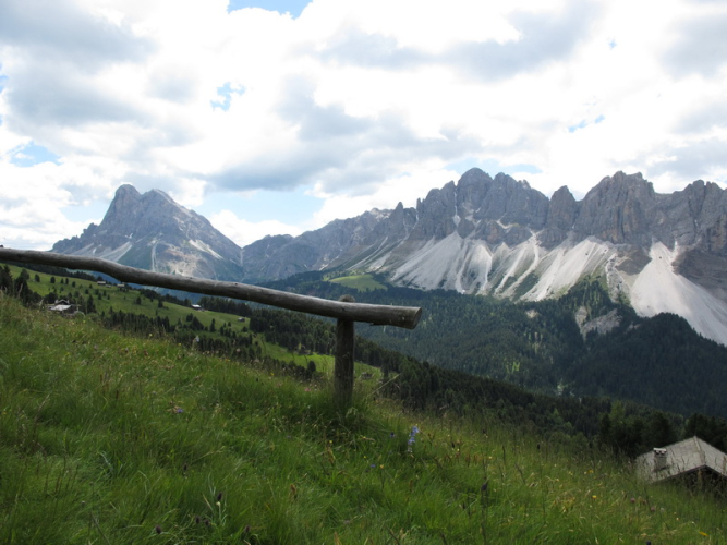 Wir verlassen die Passstraße bei der Verpflegungsstelle bei km 25 (1630 m). Iso, ein paar Kekse und weiter geht’s. 3 km und 350 HM wollen hinauf zur Peitlerknappen- und Schatzerhütte (1984 m) auf einen Rutsch genommen sein. Dann sind wir auf dem Panoramaweg, der uns auf einer Höhe zwischen 2000 und 1900 m westwärts zum Kreuztal bringt, der Bergstation der Plosebahn. Dazwischen liegen sechs wahrhaft traumhafte Kilometer durch herrlich blühende Almwiesen und mit atemberaubenden Ausblicken auf die irren Felsformationen der Geisler, die typisch sind für die Dolomiten. Aber auch die Langkofelgruppe kann man sehen, den Schlern und die Raschötz-Alm. Das Tal dazwischen ist daS Villnösstal, die Heimat von Reinhold Messner. Dahinter liegt das Grödner Tal, das der legendäre Luis Trenker bekannt gemacht hat.