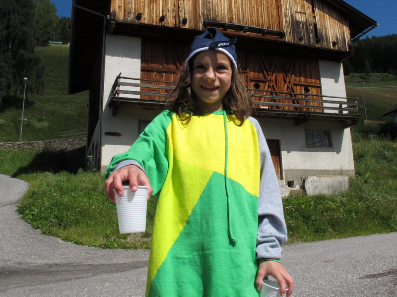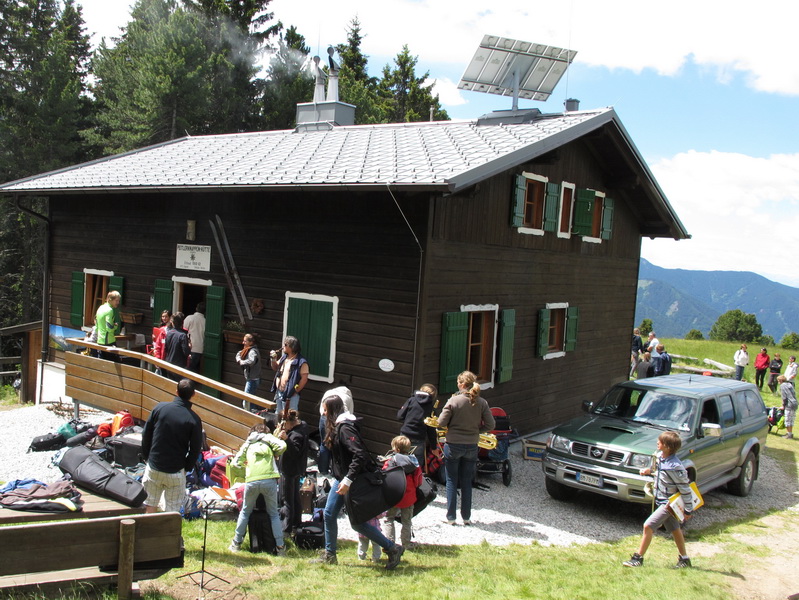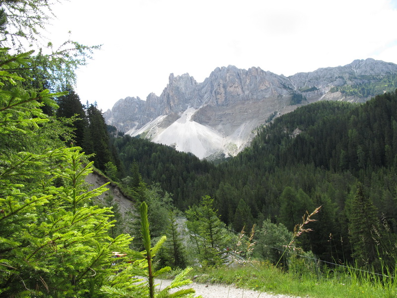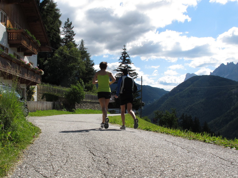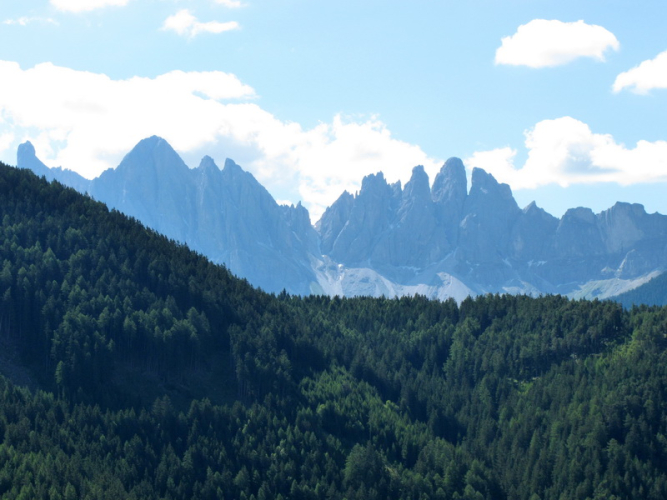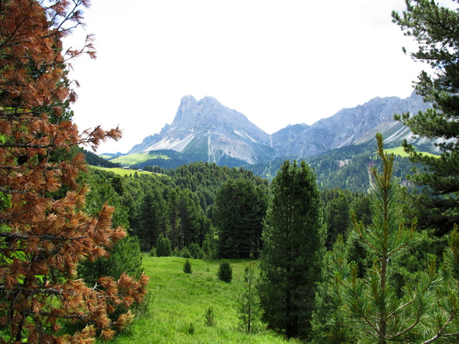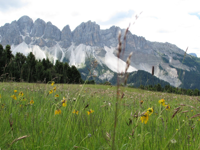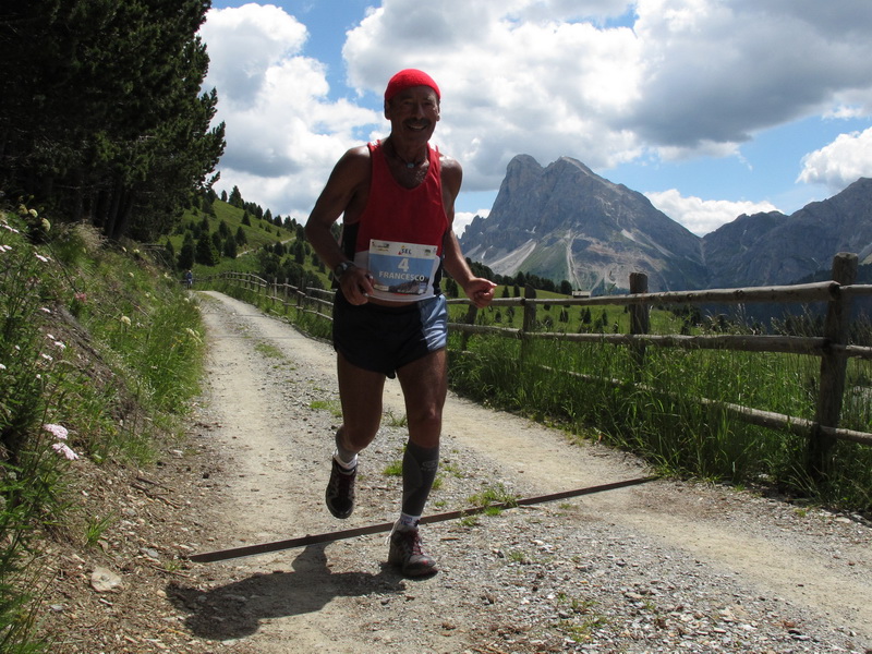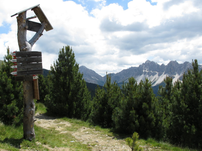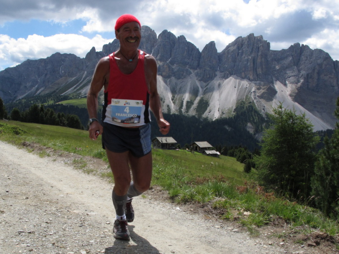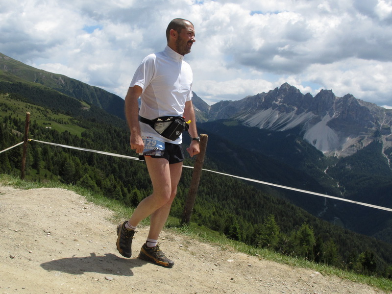 Wir verlassen die Passstraße bei der Verpflegungsstelle bei km 25 (1630 m). Iso, ein paar Kekse und weiter geht’s. 3 km und 350 HM wollen hinauf zur Peitlerknappen- und Schatzerhütte (1984 m) auf einen Rutsch genommen sein. Dann sind wir auf dem Panoramaweg, der uns auf einer Höhe zwischen 2000 und 1900 m westwärts zum Kreuztal bringt, der Bergstation der Plosebahn. Dazwischen liegen sechs wahrhaft traumhafte Kilometer durch herrlich blühende Almwiesen und mit atemberaubenden Ausblicken auf die irren Felsformationen der Geisler, die typisch sind für die Dolomiten. Aber auch die Langkofelgruppe kann man sehen, den Schlern und die Raschötz-Alm. Das Tal dazwischen ist daS Villnösstal, die Heimat von Reinhold Messner. Dahinter liegt das Grödner Tal, das der legendäre Luis Trenker bekannt gemacht hat.