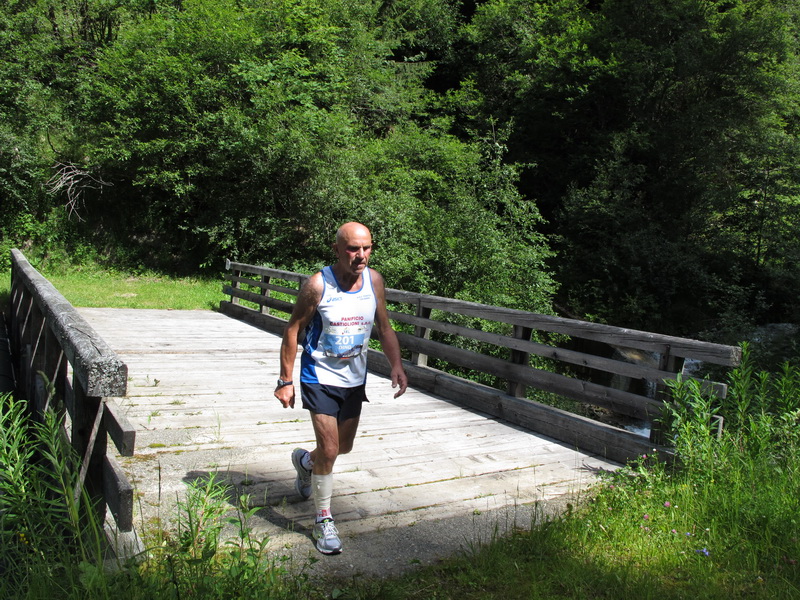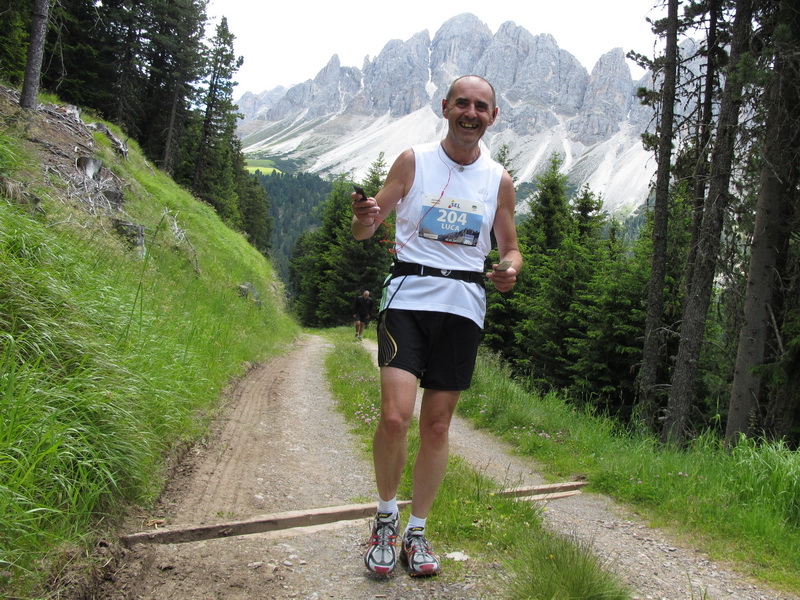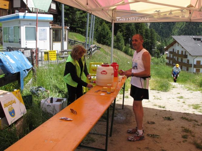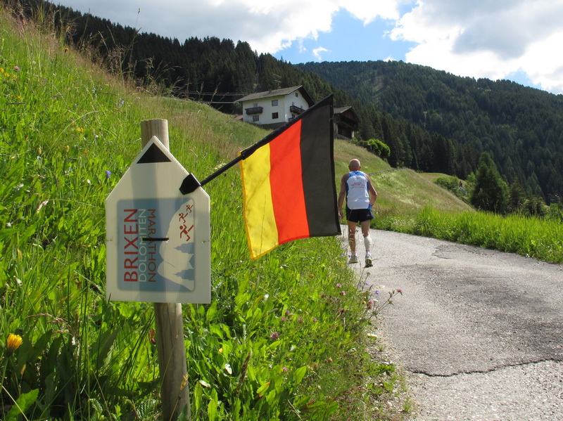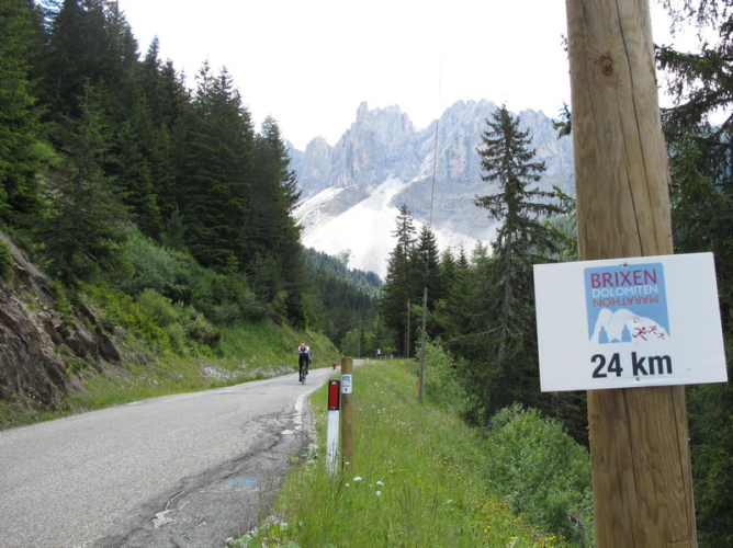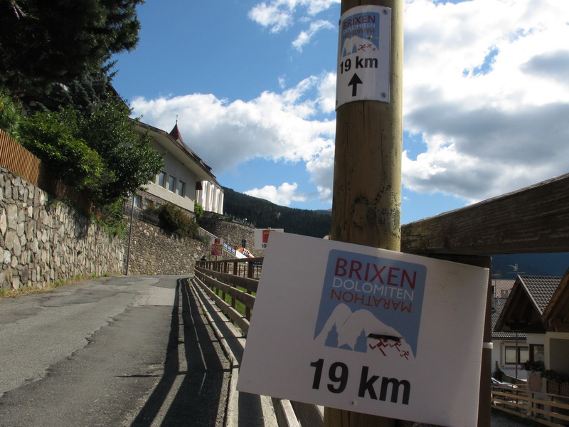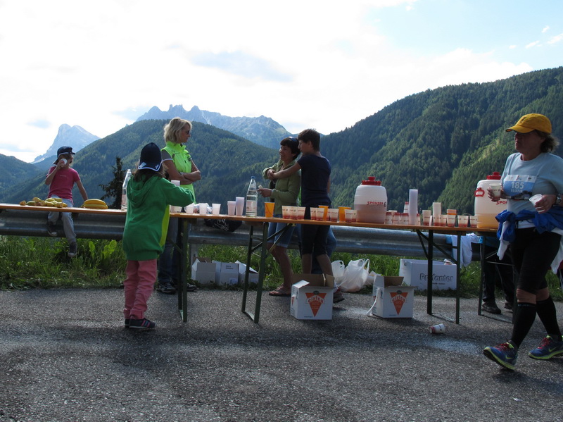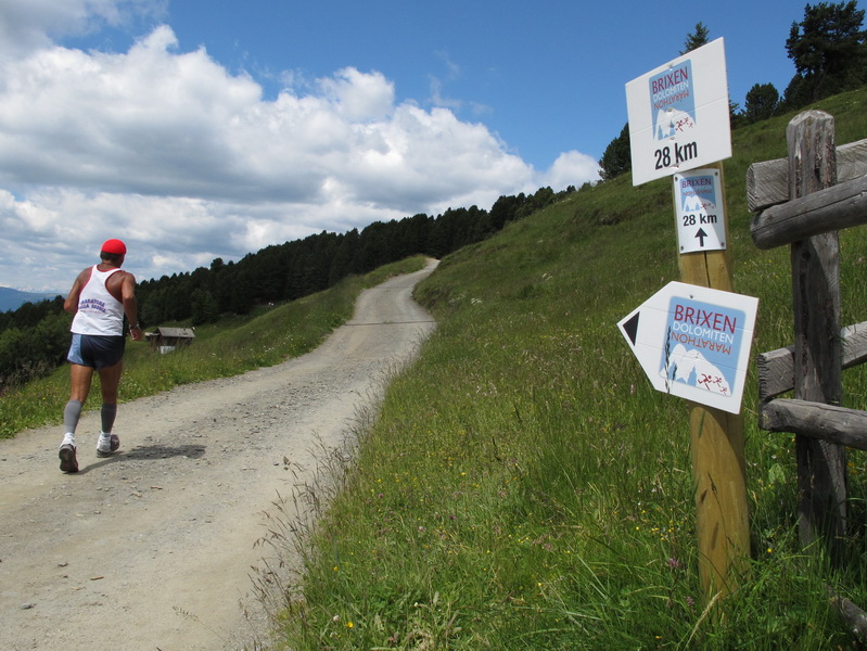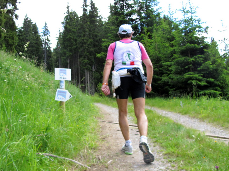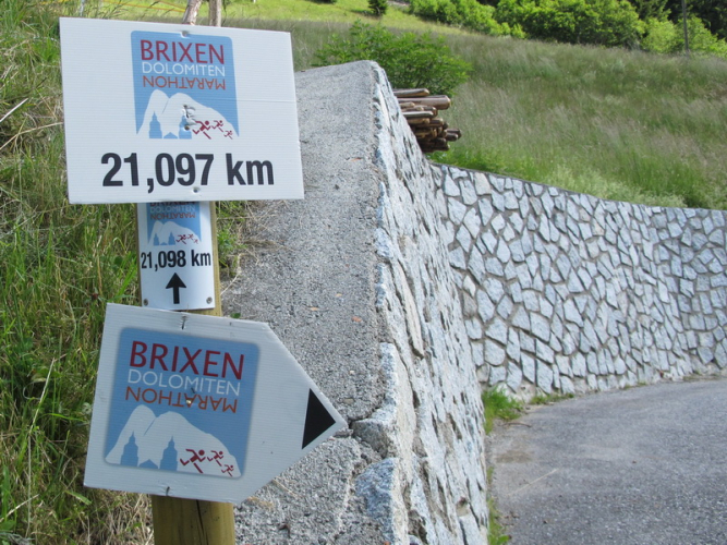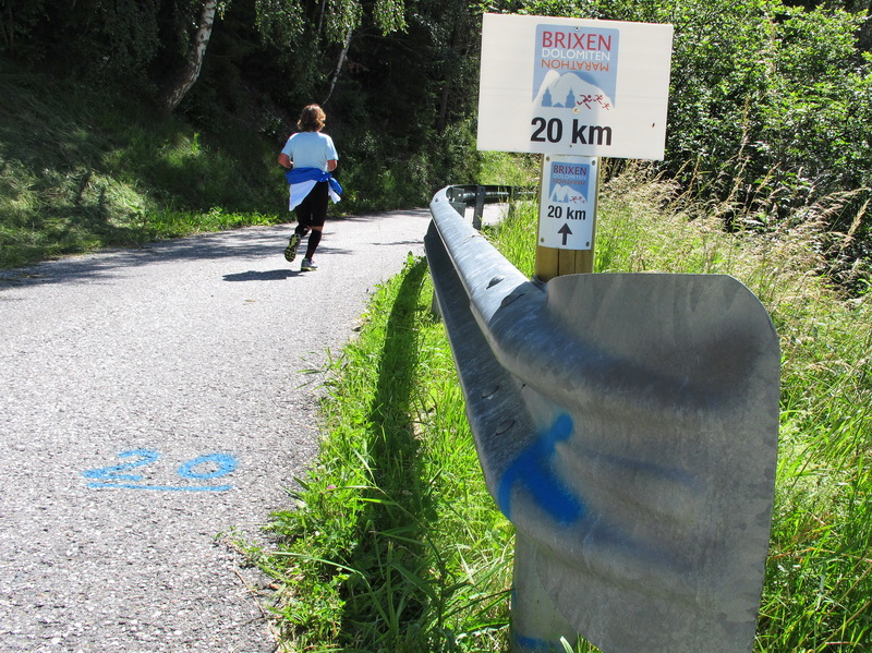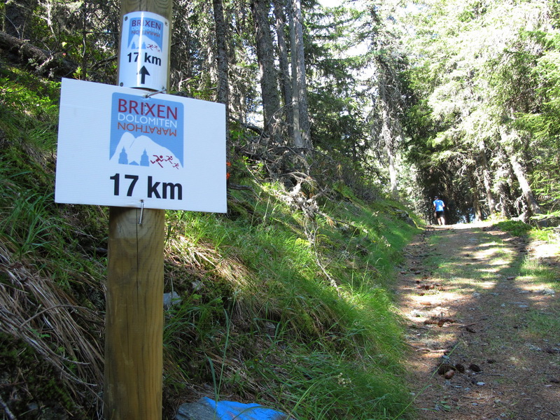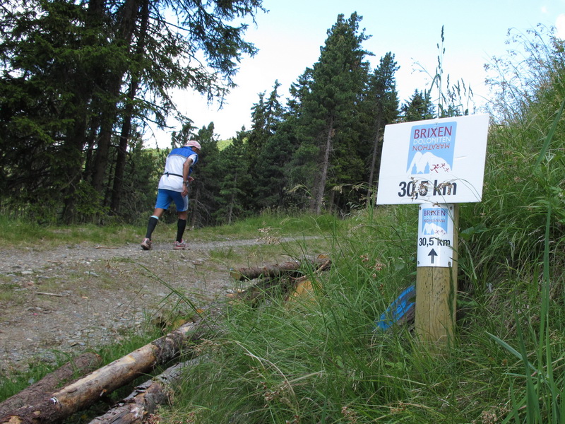 Federico ist er erste Marathoni, den ich einhole. Er ist erbärmlich beieinander. Scheinbar friert er, den Reißverschluss seines Shirts hat er bis oben zugezogen, die Fäuste krampfhaft geballt. Er spricht mich an. Ich kann kein Italienisch, er kein Deutsch. Bei Englisch schüttelt er auch den Kopf. Ich vermute, er will die Zeit wissen, die man noch bis zum Ziel braucht. Die Kilometer kann er nicht meinen. Alle 1000 m steht ein Schild, ab km 30 sogar alle 500 m. Selbst wenn ich könnte, ich würde es nicht wagen, es ihm zu sagen. Ich wäre nicht der erste Überbringer einer schlechten Nachricht, den man umbringt. Stattdessen hoffe ich, dass er bei der Verpflegungsstelle an der Skihütte (km 31 – 1900 m) aufgibt.