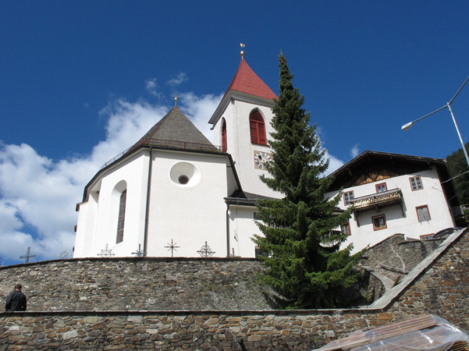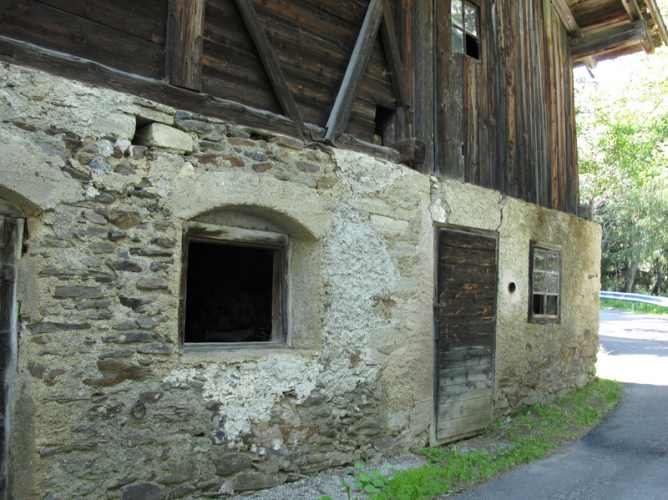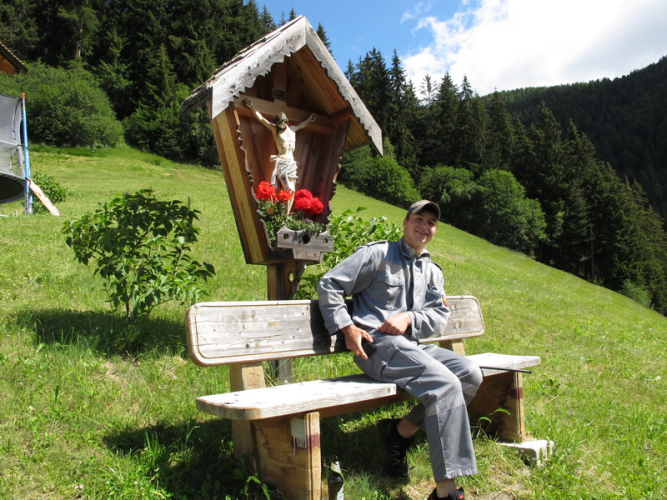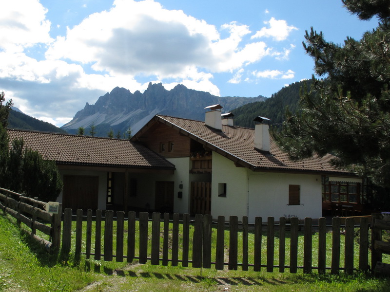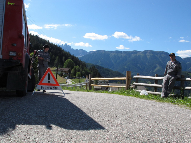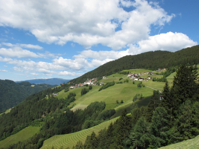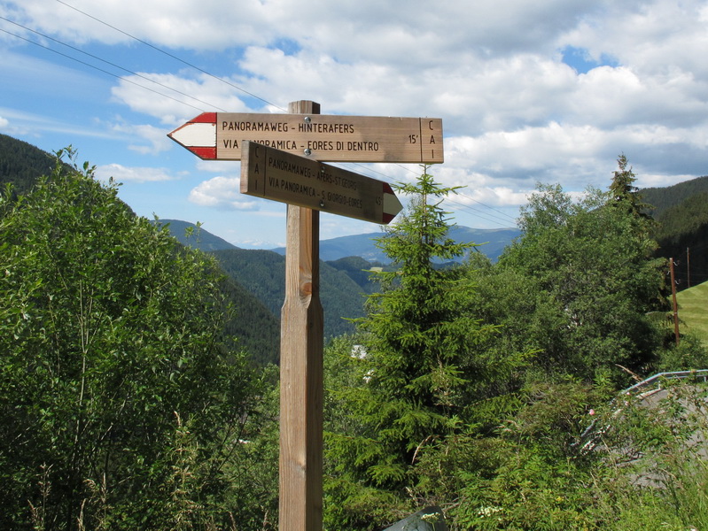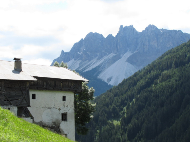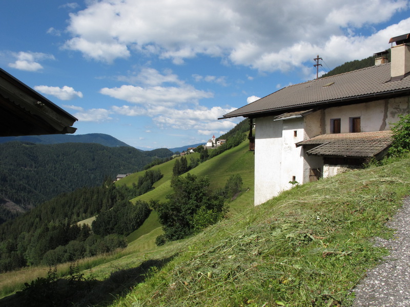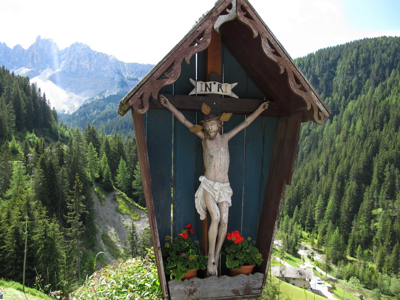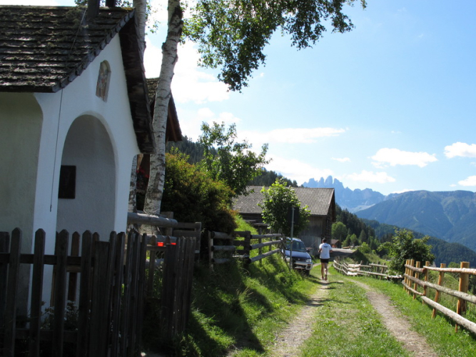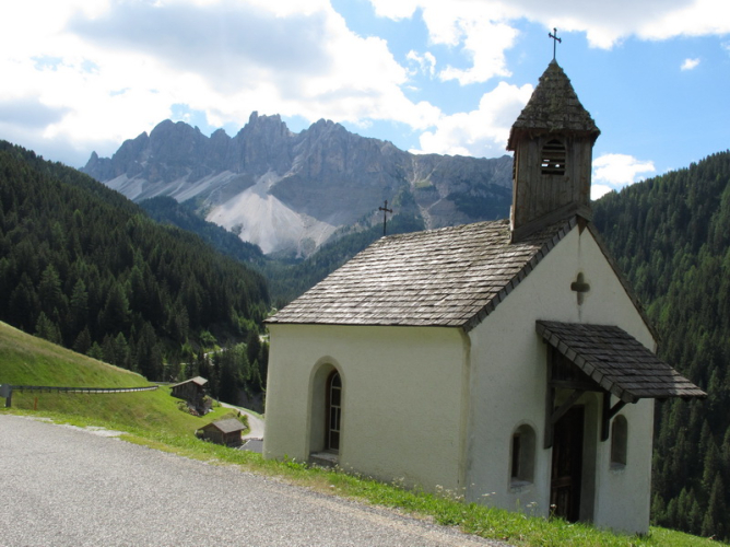 Die nächsten Kilometer verlaufen meist auf einer schmalen Teerstraße, abwechselnd rauf und runter. Mal bietet ein alter Bauernhof, mal eine malerische Kapelle oder ein Kruzifix mit den Geislerspitzen im Hintergrund ein lohnendes Fotomotiv. Wir sind in Hinterafers und stoßen wieder auf die schmale Verkehrsstraße, die zum Würzjoch führt. Über die Passhöhe (2003 m) kommt man schon seit Urzeiten ins Gadertal. Man hat einmal einen Stein mit einer vermutlich römischen Inschrift gefunden. Beim Ausbau der Straße verschwand der Stein auf Nimmerwiedersehen. Ein Foto existiert auch nicht.
