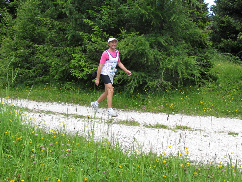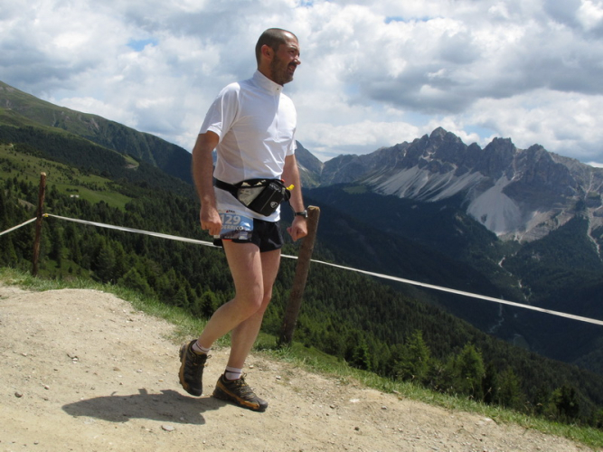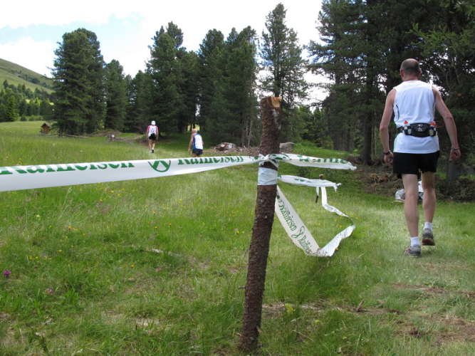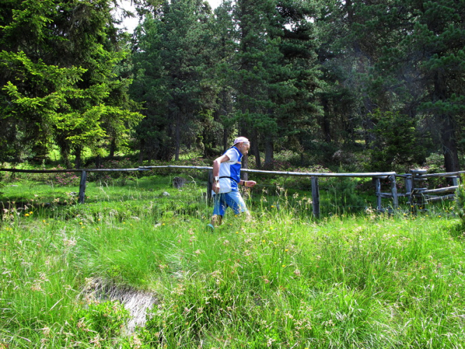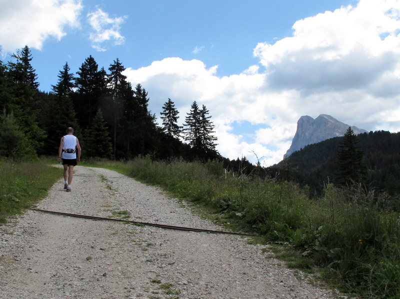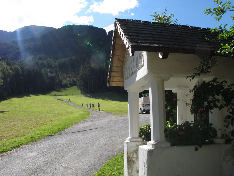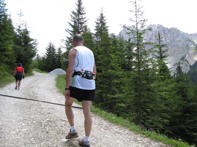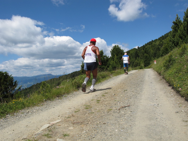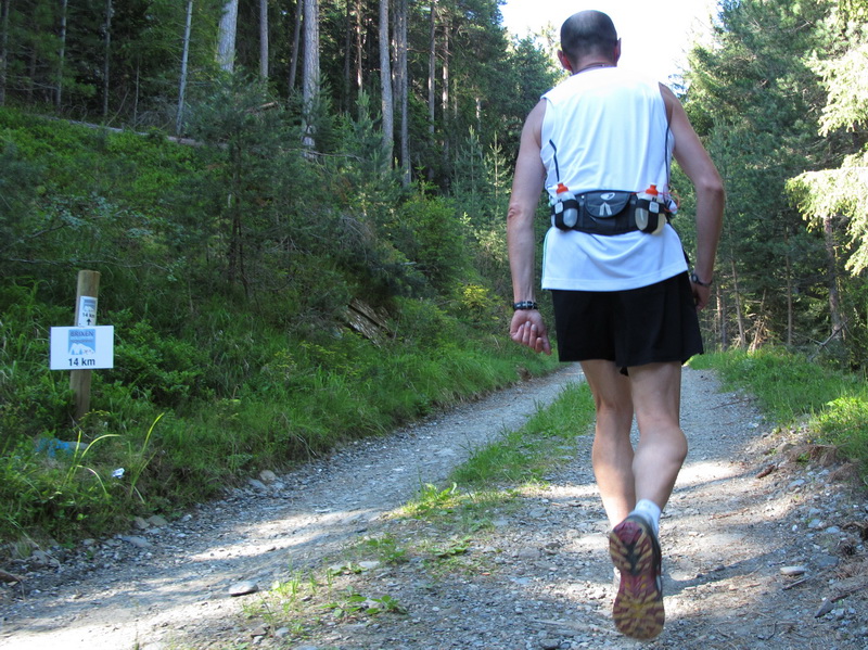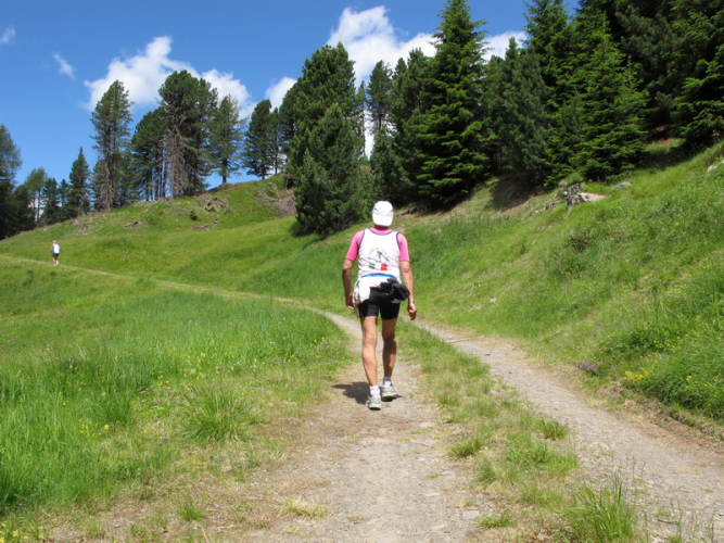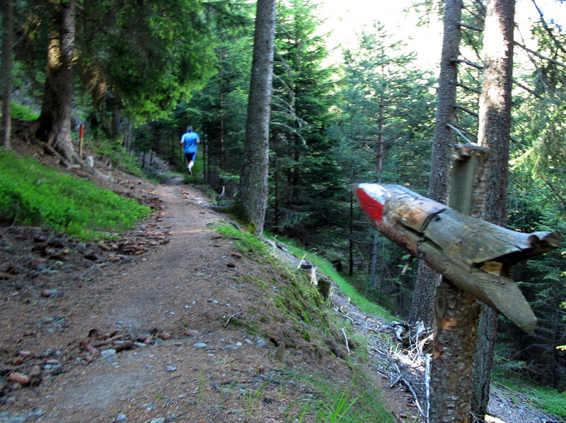 Jetzt kommt ein Streckenabschnitt, der typisch ist für diesen Marathon. Der Weg ist gar nicht schlecht und die Steigung eher mäßig. Laufen? Ja. Normalerweise. Aber wir haben noch nicht einmal ein Drittel der Strecke hinter uns. Gehen? Normalerweise nein. Aber wir haben noch 1700 HM vor uns. Im Klartext: in meiner Preisklasse sind auch diese bequemen Wege auf Dauer zu „steil“ zum Laufen. Die Flach- und Abwärtspassagen gleichen das nicht aus. Deshalb ist man hier länger unterwegs als beispielsweise beim Jungfrau- oder Zermatt-Marathon. Interessanterweise sagt mir das auch Hermann Achmüller, der zum zweiten Mal gewinnt und deutlich über seiner Jungfrau-Zeit bleibt.