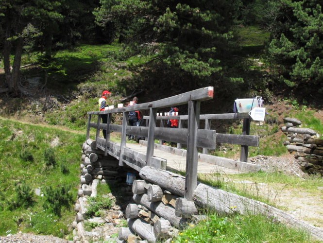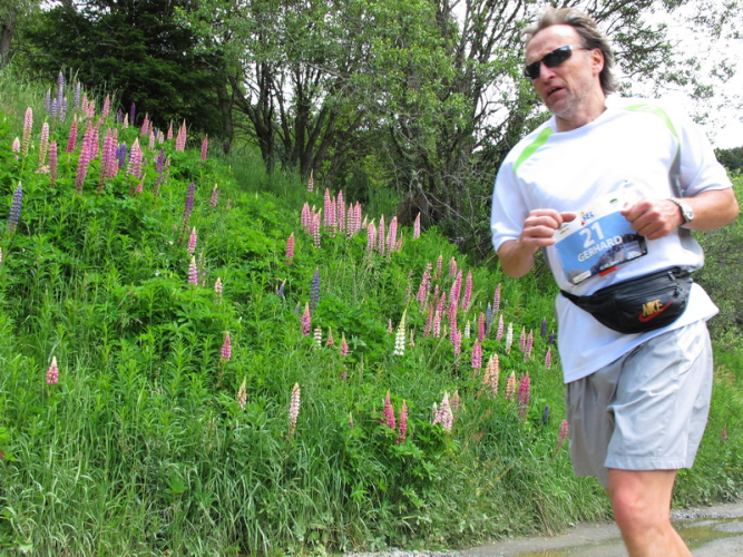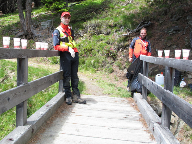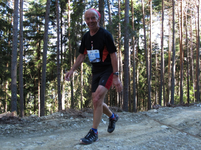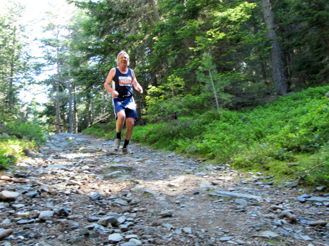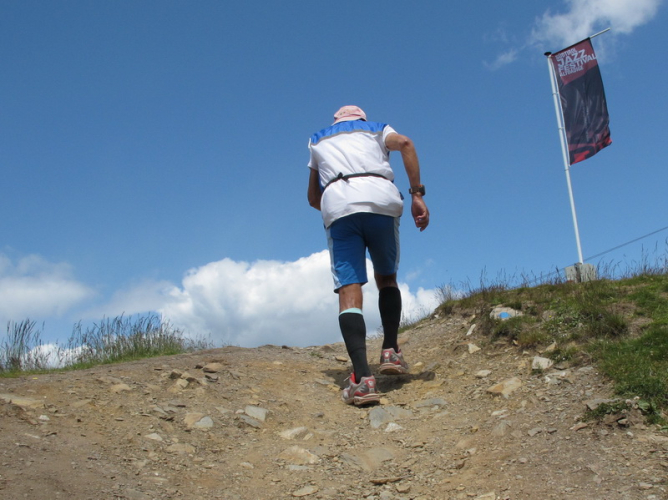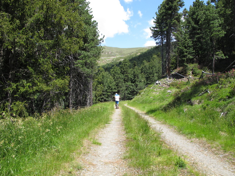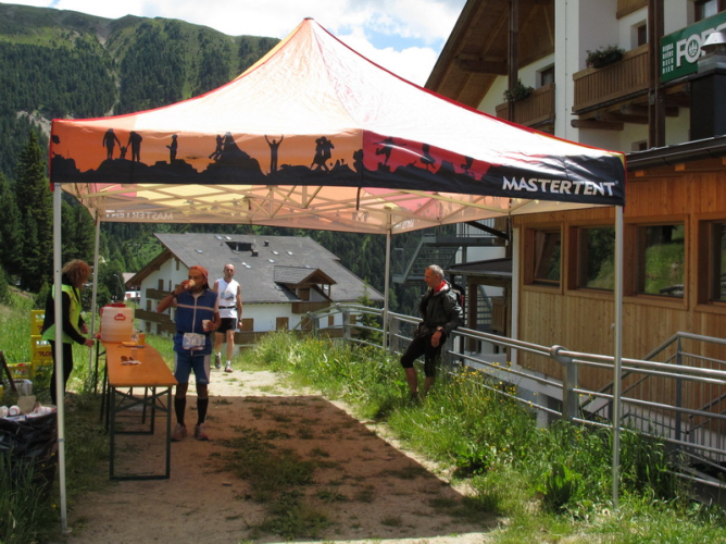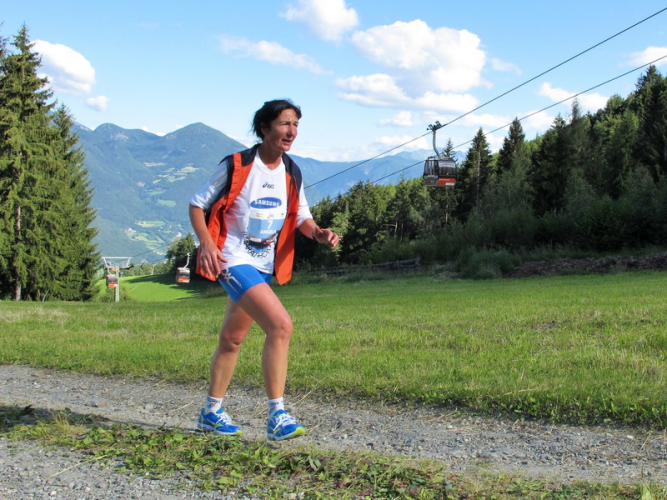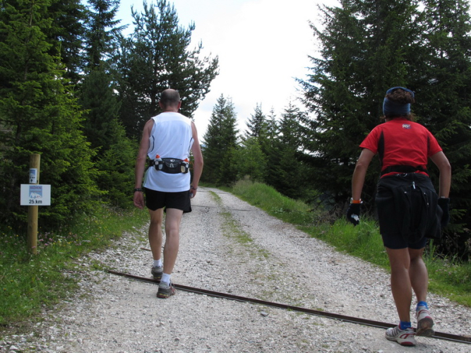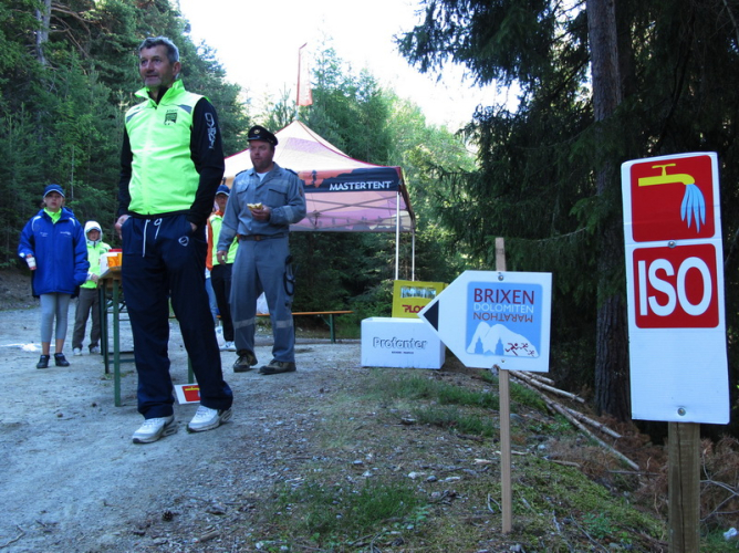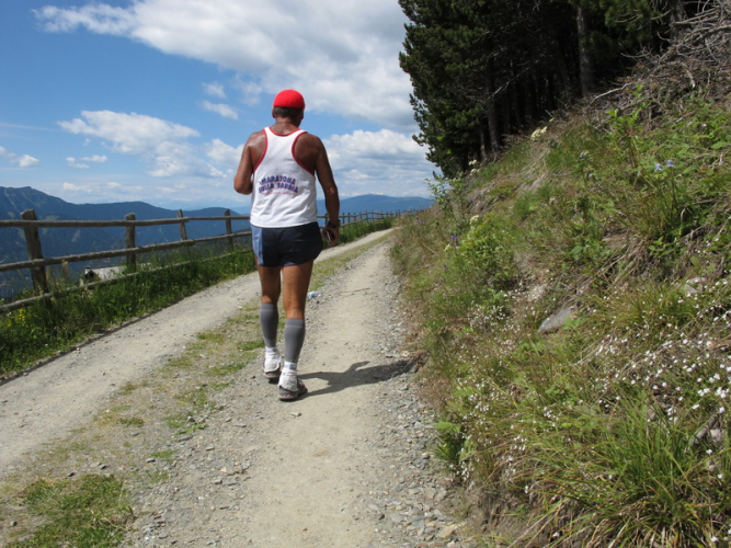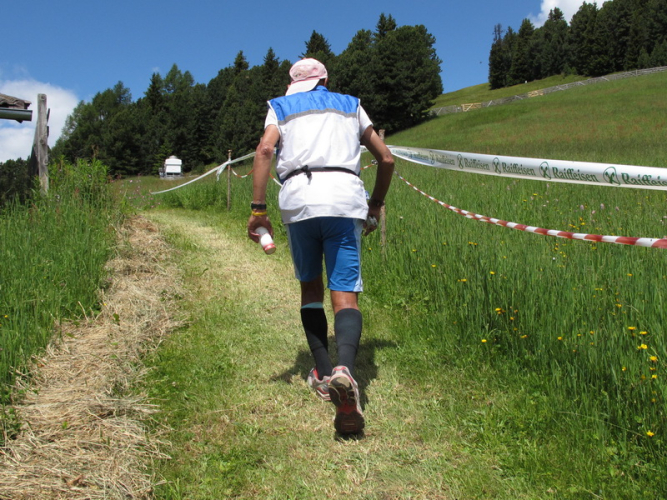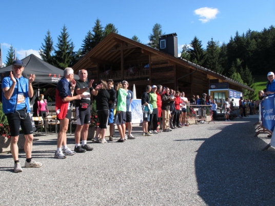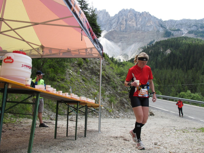 Jetzt kommt ein Streckenabschnitt, der typisch ist für diesen Marathon. Der Weg ist gar nicht schlecht und die Steigung eher mäßig. Laufen? Ja. Normalerweise. Aber wir haben noch nicht einmal ein Drittel der Strecke hinter uns. Gehen? Normalerweise nein. Aber wir haben noch 1700 HM vor uns. Im Klartext: in meiner Preisklasse sind auch diese bequemen Wege auf Dauer zu „steil“ zum Laufen. Die Flach- und Abwärtspassagen gleichen das nicht aus. Deshalb ist man hier länger unterwegs als beispielsweise beim Jungfrau- oder Zermatt-Marathon. Interessanterweise sagt mir das auch Hermann Achmüller, der zum zweiten Mal gewinnt und deutlich über seiner Jungfrau-Zeit bleibt.