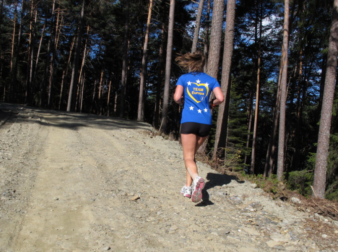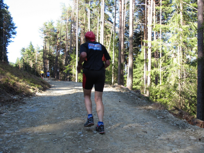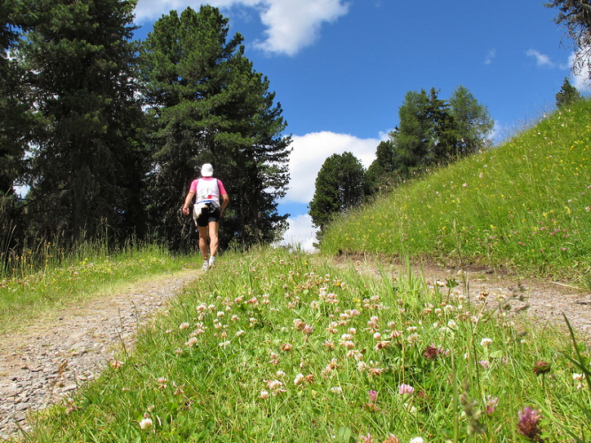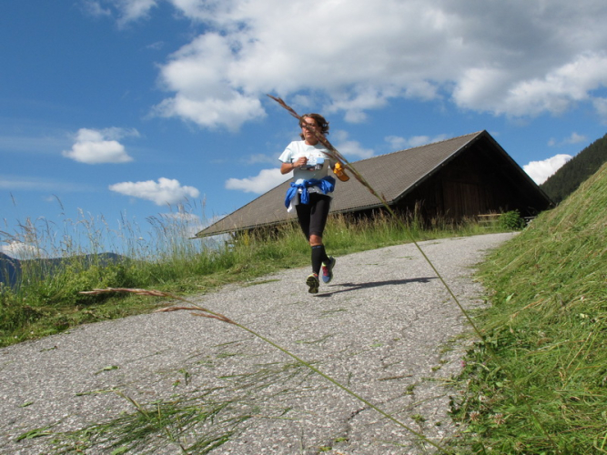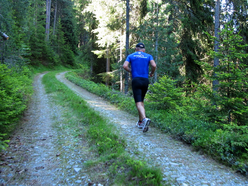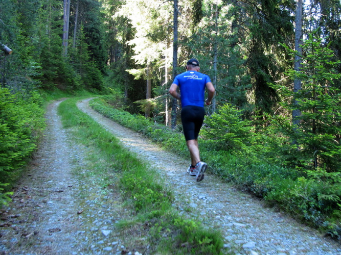 Nach dem kleinen Imbiss braucht man gar nicht erst anfangen zu laufen, denn der Wiesenweg bis zur Forststraße unterhalb der Seilbahn ist ziemlich steil. Erst dort kann man in der angenehmen Sonne wieder etwas Fahrt aufnehmen. Letztes Jahr freute ich mich über jeden Baum, der einen Schatten warf. Heute ist es umgekehrt und im Schatten in den nassgeschwitzten Klamotten fast zu kühl.