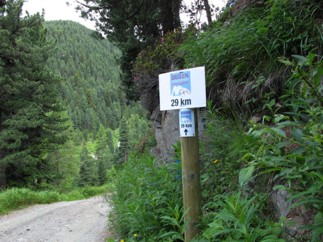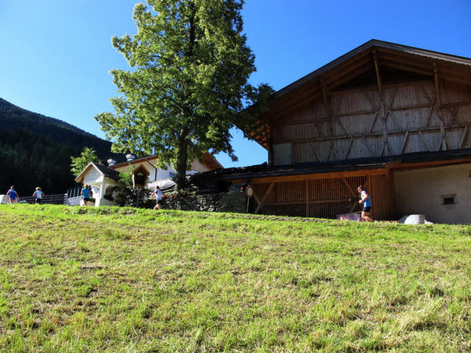 Nicht schlimm, ich sag’s nur. Man hat 8 Stunden Zeit und das sollte genügen, auch wenn man wie ich dauernd was zum Fotografieren entdeckt. Hinunter zum Drockerhof und weiter nach St. Georgen (km 19,2 – 1504 m) kann man es wieder mal rollen lassen, verliert aber auch einige Höhenmeter. Zum ersten Mal sieht man die Spitzen der Geisler, die man in Aferer und Villnösser Geisler unterscheidet. Gleich kommt auch der Peitlerkofel (2875 m) zum Vorschein. Er ziert das Logo des Brixen Dolomiten Marathon. Hier überqueren wir die Verkehrsstraße, die zum Kreuztal und zum Würzjoch führt. Wenig oberhalb liegt Palmschoß, wo man in den 1950er Jahren eine Mineralquelle entdeckte. Heute wird das Plose-Mineralwasser in ganz Südtirol ausgeschenkt. In Palmschoß ist auch das von mir gelobte Hotel.