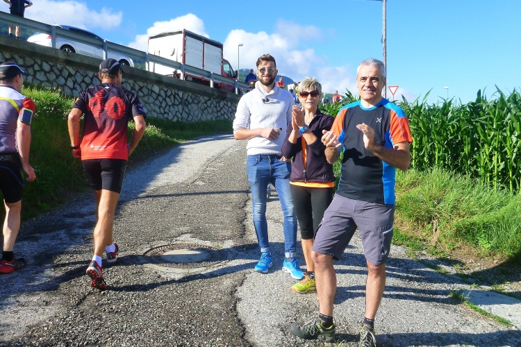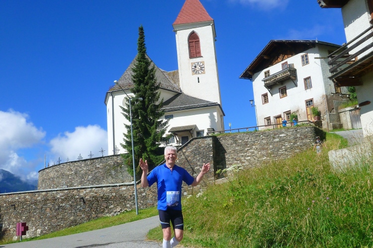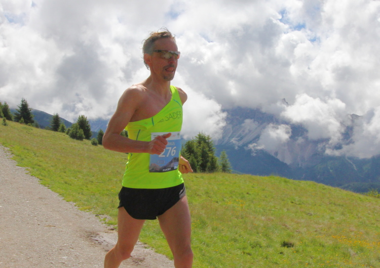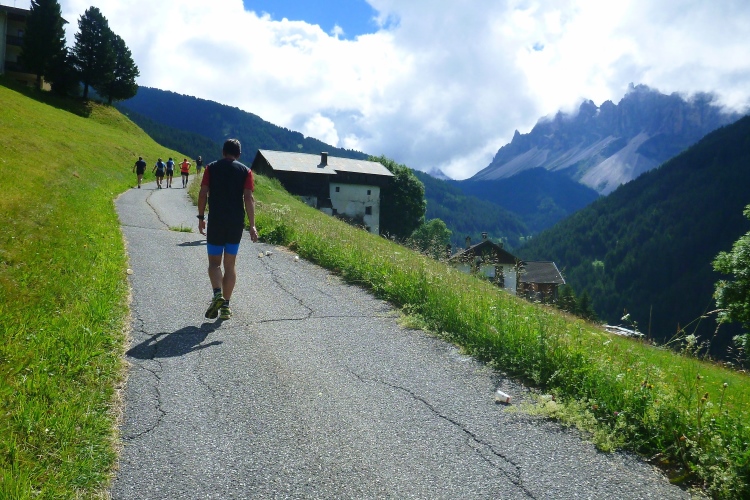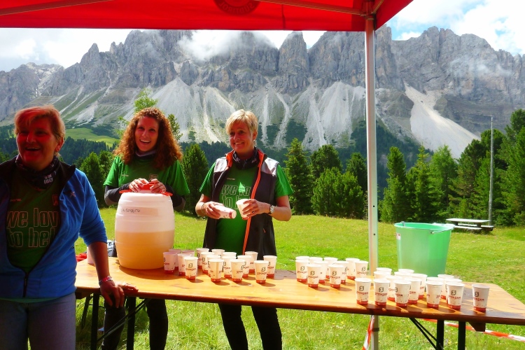 In St. Georg bei km 19 erwartet uns der nächste Staffelwechsel samt hervorragender Verpflegungsstation. Besonders die herzförmigen Bio-Kekse haben es mir angetan. Tipp: Wenn man zu viele davon in den Mund steckt, wird das Schnaufen beim Laufen anstrengender. Die 17 VPs sind perfekt ausgestattet, manche mit Bananen, Äpfel und Melonen, später gibt es mehrmals Gel-Tütchen. Da die VPs meist in Ortschaften oder an Berghütten liegen, gibt es auch Toiletten. Den Betreuern und mir macht das hier in der Sonne richtig Spaß. Manchmal sieht man auf der Straße die Feuchtigkeit verdunsten. Leicht wellig weiter durch pittoreske Wiesenhänge. Vor uns tauchen majestätisch die Gipfel der Aferer Geisler auf. Ich erkläre Judith, auf welche Spitze wir heute noch rauf müssen. Dieter aus dem Eisacktal widerspricht energisch. Natürlich geht es da nicht hinauf. Dies sind die Berge, in denen die Messner-Brüder Reinhold und Günther ihre Jugend verbracht haben. Ein Klettersteig wurde nach dem verstorbenen Günther Messner benannt.