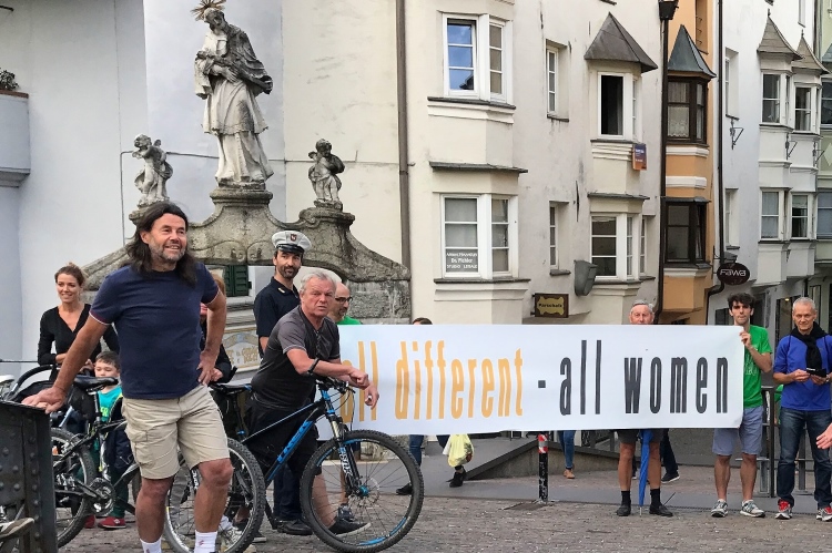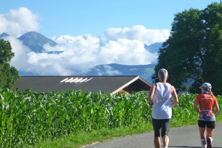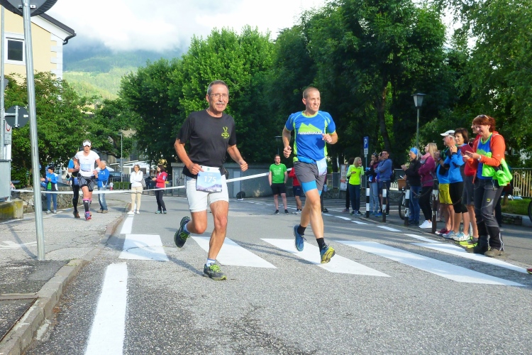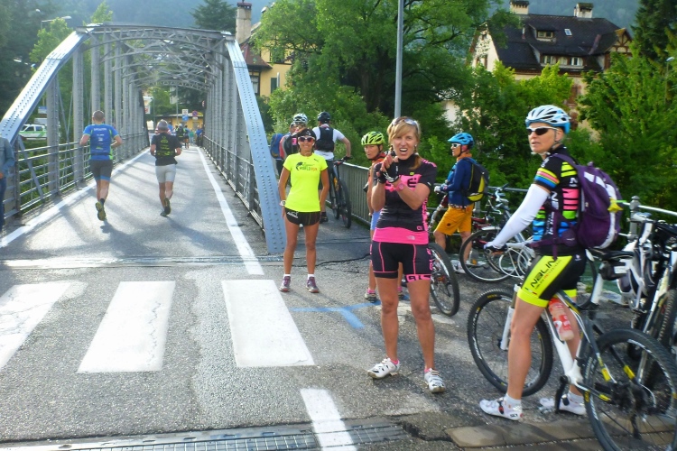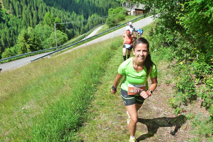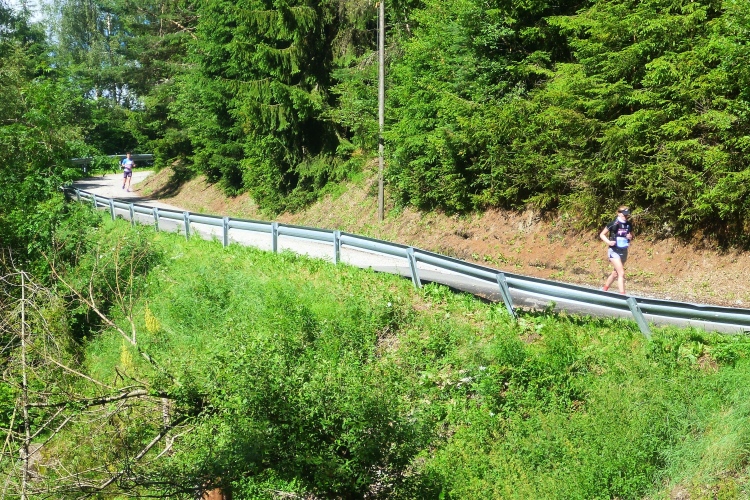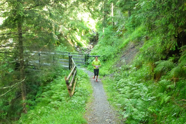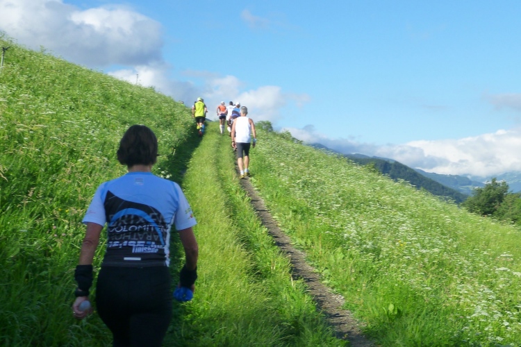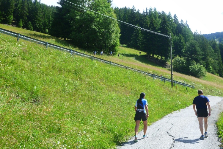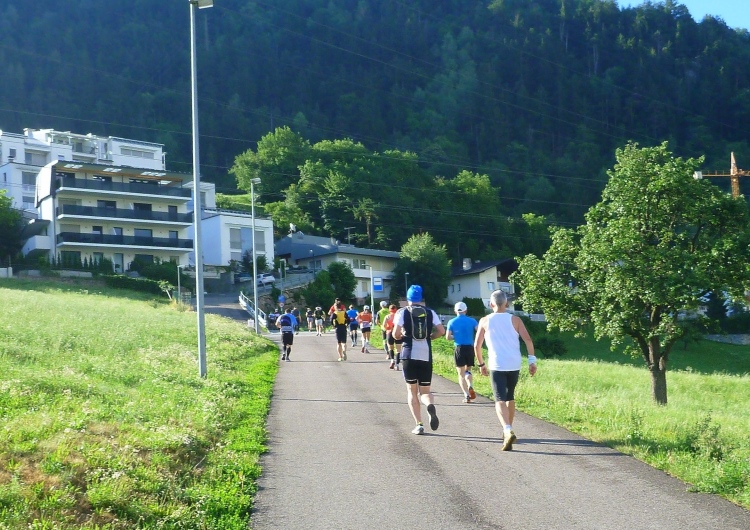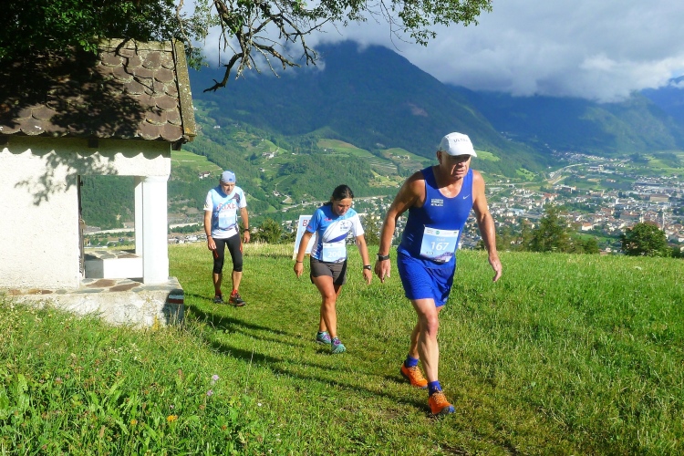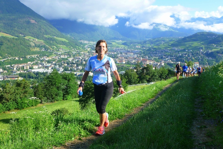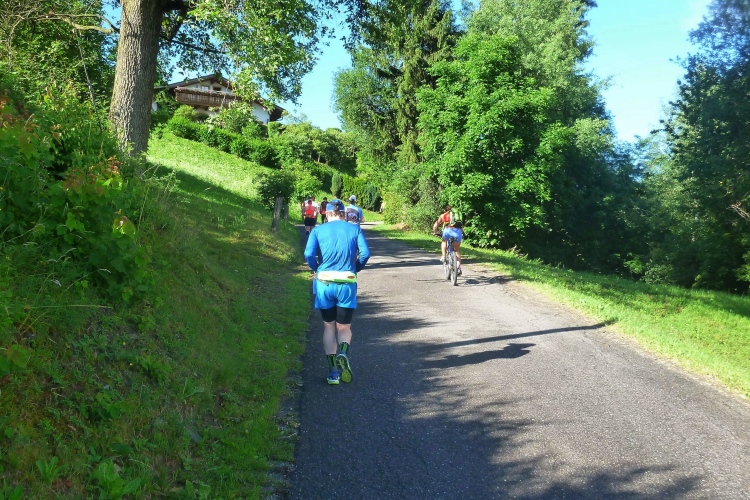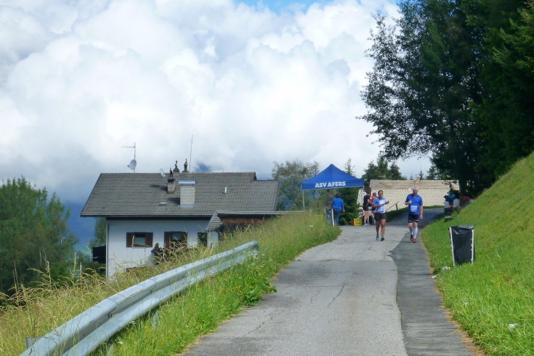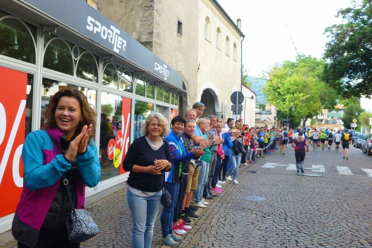 Ein wenig an der Eisack entlang und dann über die Widmannbrücke am Zusammenfluss von Rienz und Eisack, die in Bozen in die Etsch münden. Kurz nach Kilometer 4 ist es mit dem schnellen Laufen vorbei. Die ersten Höhenmeter stehen an und bald danach sind wir zwischen den Bäumen auf der Karlspromenade, benannt 1903 nach Erzherzog Karl I., der hier zur Kur weilte und diesen Weg sehr schätzte. Die ersten schönen Ausblicke auf das Tal. Über Wege und kleine Straßen geht es weiter durch die Almwiesen leicht bergauf. Wobei „leicht“ für Judith und mich schon „marschieren“ bedeutet. Bei Landhäusern, Höfen oder Straßensperrungen stehen immer gut gelaunte Zuschauer. Ich komme mit Notburga aus Klausen ins Gespräch. In ihrem Heimatort verbrachten wir einen Urlaub, als ich ein Jahr alt war. Somit habe ich sicher auch den Spielwarenladen besucht, den Notburgas Familie dort betreibt.