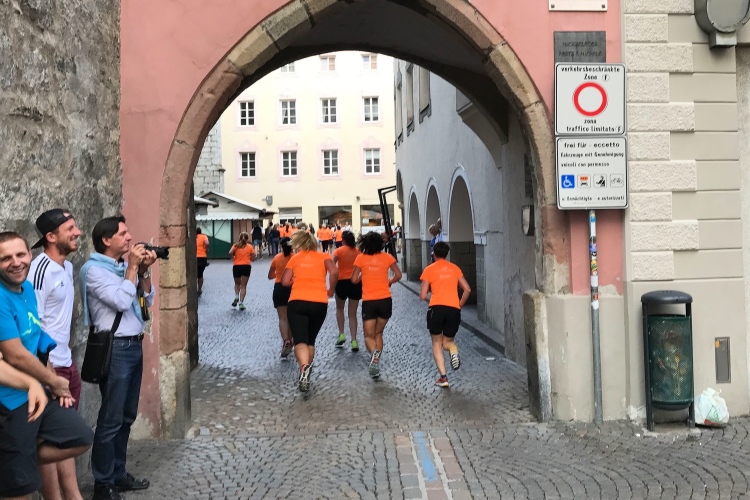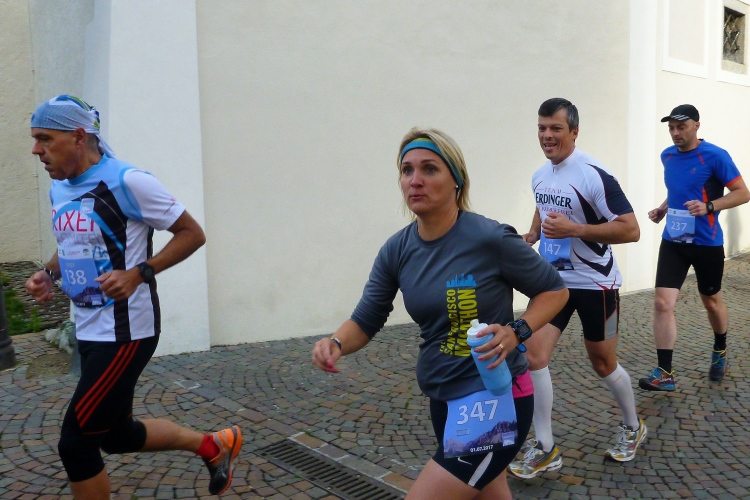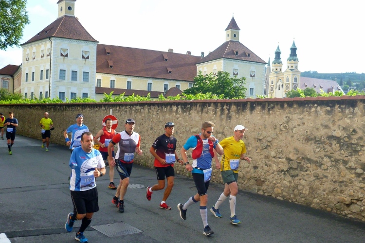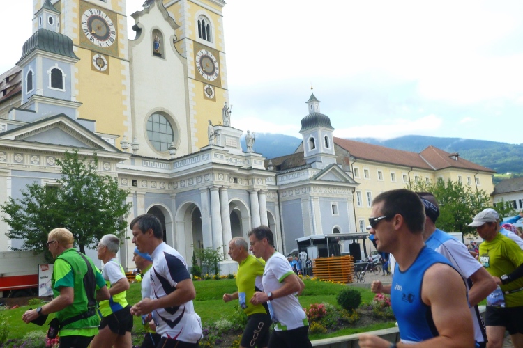 Start um 7:30 Uhr. Laufend ist die Altstadt schnell umrundet. Unzählige Zuschauer feuern uns zu dieser frühen Stunde an. Dann geht es auf einen flachen Stadtparcours. Am Hotel Elefant vorbei. Wahrscheinlich hat Hannibal mit seinen Dickhäutern da schon übernachtet. Dann passieren wir die Hofburg, bis 1803 Sitz der Fürstbischöfe und bis 1973 der Bischöfe der Diözese Brixen. Heute befindet sich hier das Diözesanmuseum mit sakraler Kunst von der Romanik bis zur Moderne, dem Domschatz von Brixen, Werken Tiroler Künstler des 19. Jahrhunderts, einer Krippensammlung und wechselnden Sonderausstellungen.
