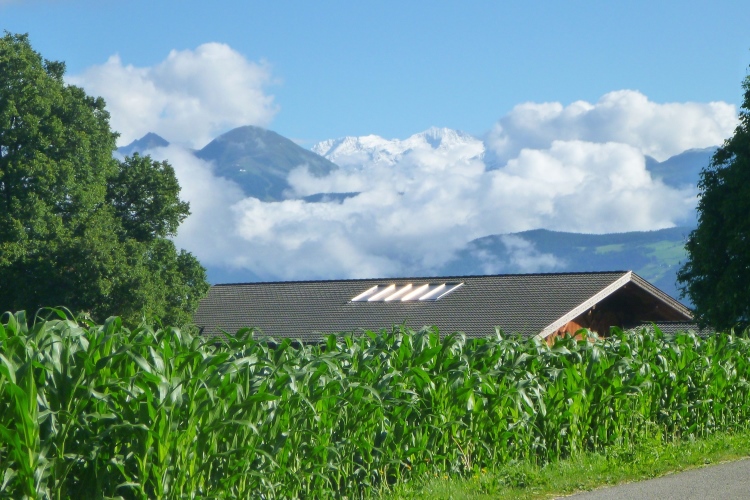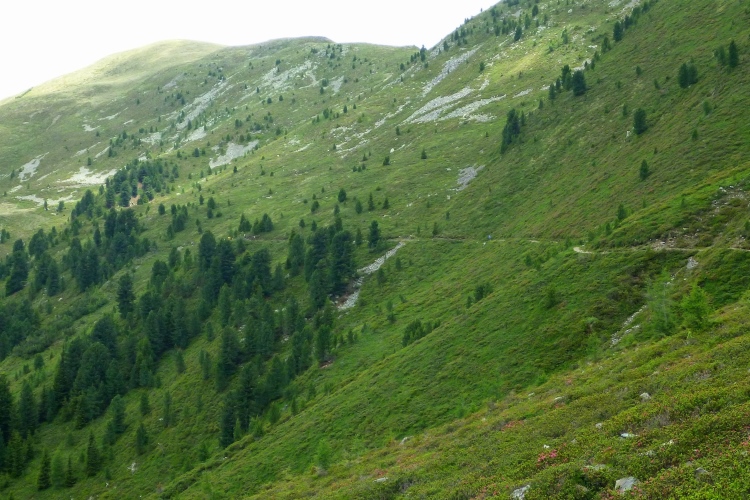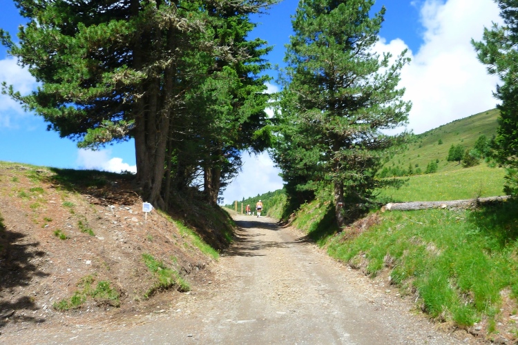 Ein schöner Wandersteig führt nach oben. Gute Stufen. Umdrehen lohnt, wegen des Blicks ins Tal auf Brixen und die Gletscher der Stubaier und Zillertaler Alpen. Judith forciert das Tempo. Ich fühle mich total ausgepowert. Das Aufholen nach Fotostopps fällt mir immer schwerer. Die Anfeuerungsrufe und das Kuhglockengeläut von oben kommen näher. Wir werden auch von einer Getränkestation erwartet.