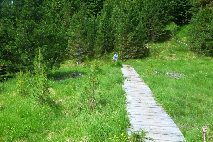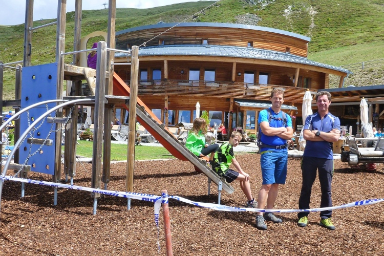Wir überqueren noch einmal die Würzjoch-Passstraße, die ins Gardertal führt. Oft war ich in den Dolomiten schon unterwegs, aber es gibt immer noch Gebiete, die ich nicht kenne. Für uns geht es jetzt etwa13 Kilometer an der Baumgrenze entlang, quasi wieder aus dem Seitental Richtung Brixen zurück. Der leicht wellige Parcours führt oft über Wurzeln und Steine und ist laut Streckenplan schon als alpiner Steig definiert. Dann hinauf zur Bergwertung bei der Rossalm. Die Bezeichnung „Ferienhütte“ ist wohl ziemlich untertrieben. Sogar eine Panorama-Sauna wartet hier auf die Gäste. Vier Kilometer über den Woodywalk zügig bergab. Dabei handelt es sich um einen „Holzweg“ für die ganze Familie. Viele Attraktionen aus Holz warten auf Groß und Klein, samt Tümpeln zum Abkühlen. Judith gibt jetzt Gas, sammelt einige Mitstreiter ein und ich haste unter dem Beifall vieler Woodywalker hinterher.