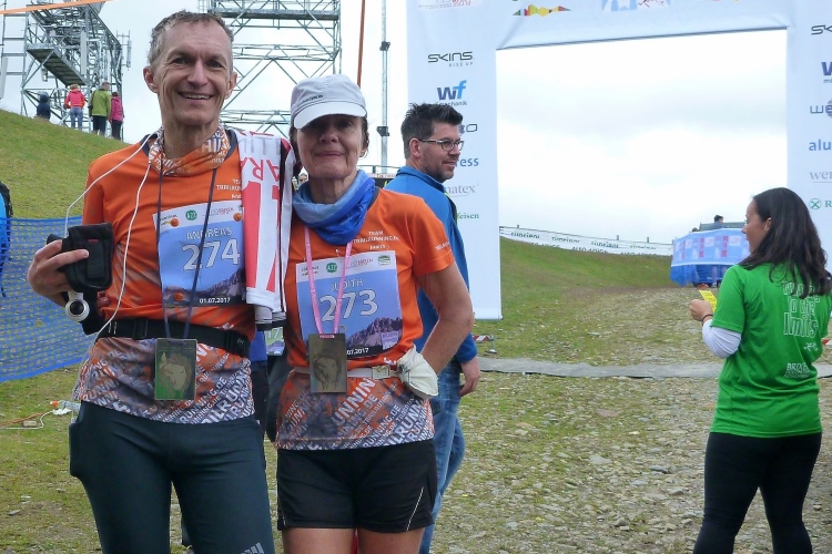 Die Verpflegung erhalten wir im Zelt, vor dem frischen Wind geschützt, Das Finisher-Hemd gibt es dieses Jahr in Rot. Die Medaille setzt die Serie der letzten Jahre fort: “Move like a Cat - Run like a Horse - Race like a Wolf...floW“ ist dort eingraviert. Das Design stammt von Peter Senoner, realisiert auf schwerem, poliertem Edelstahl von WF Mechanik und Weico. Befestigt ist das Ganze an einem recycelten Laufschuhband. Was ganz Besonderes. Die Kleiderbeutel gibt es im Schuppen nebenan. Vor der Hütte steht das Zelt für die Pastaparty. Duschen kann man hier oben auch.