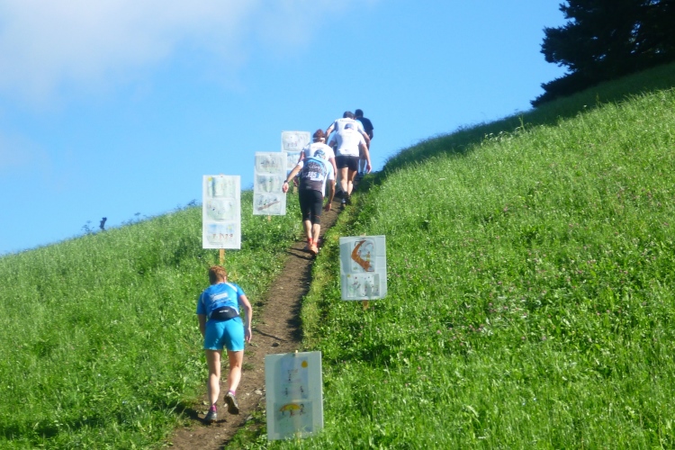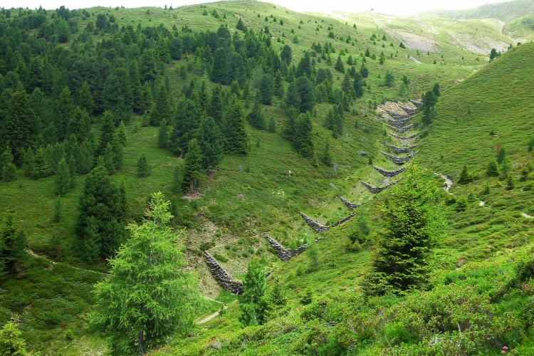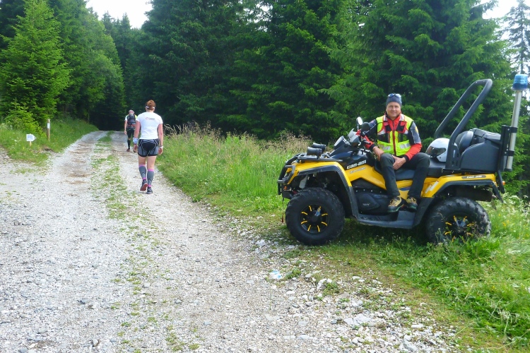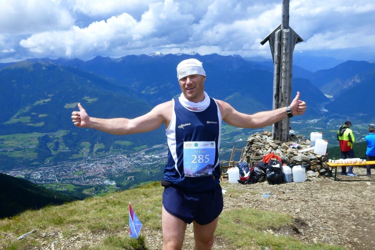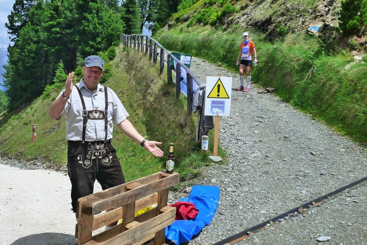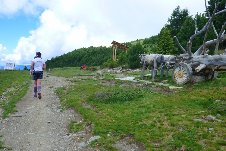Die Verbauung des Tramötschbachs fasziniert mich. Während der Schneeschmelze muss hier ganz schön was abgehen. Was ich gar nicht wahrnehme, ist der Funkmast auf dem „Hügel“. Keine 300 Höhenmeter sind es dort hinauf. Das passiert mir in Südtirol öfter: Man sieht einen netten „einfachen“ Berg mit Gipfelkreuz und plant eine Wanderung. Dass diese harmlosen Erhebungen aber über 2.000 Meter hoch sind, stellt man erst fest, wenn man nach stundenlanger Wanderung auf halber Höhe wieder umkehren muss. Wir müssen das heute aber hoffentlich nicht. Ich mahne Judith zur Eile, habe ich doch im letztjährigen Bericht gelesen, dass der Lauf wegen eines Gewitters auf der vor uns liegenden Ochsenalm abgebrochen wurde. Und gerade ziehen ein paar Wolken auf. Hinter der nächsten Kurve sehe ich über uns ein Gipfelkreuz mit farbigen Punkten auf dem Weg dorthin. Schluck. Erst mal rasant zur Alm. Km 39, wir geben uns den Rest, wie wir es auch mit dem Müllsack tun sollen, der diese Aufschrift trägt.