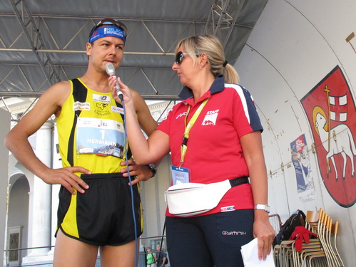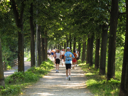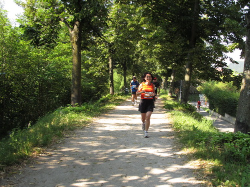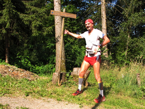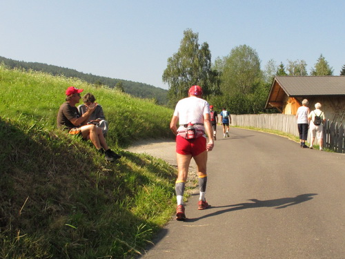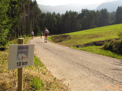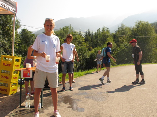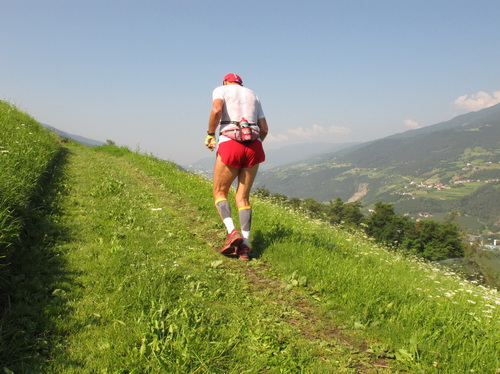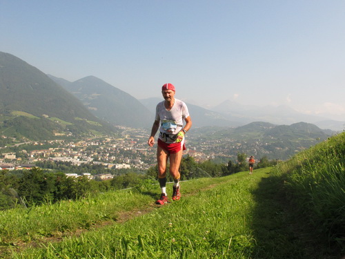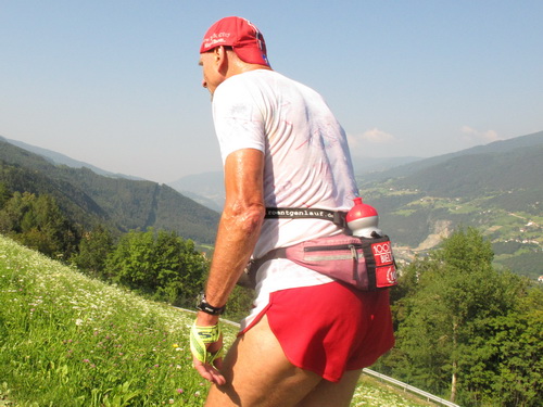 Kein Lüftchen geht, als nach 4 Kilometern das Einlaufen jäh beendet wird und die Wegrichtung nach oben zeigt. Ist es nicht ganz so steil, will man zeigen, dass man gut trainiert hat und läuft, bis der Pulsmesser Alarm gibt. Die Aussicht auf die Stadt und die Berge ist herrlich, der alte Bauernhof bestimmt längst verlassen und an der Kapelle bleibt trotz Atemnot Zeit für ein kurzes „bring uns gesund ins Ziel.“ Zweimal konnten wir uns schon erfrischen, dann ist bei km 9,6 die Talstation der Plose-Bergbahn und die erste große Verpflegungsstelle erreicht. Jeder Teilnehmer hat einen Verpflegungsplan bekommen, und weiß, wann er was bekommt. Aufgrund der vorhergesagten Hitze hat man noch vier weitere Getränkestellen (= insgesamt 20!) eingerichtet.