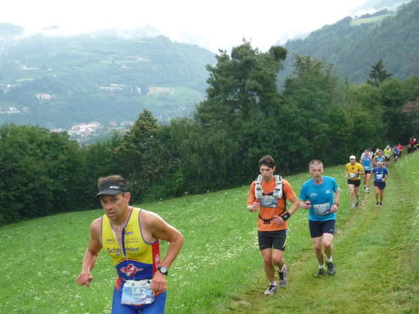 Oberhalb des Dorfes St. Andrä werden wir schon erwartet. An der Talstation der Kabinenbahn zur Plose, 1.067 m üNN und damit schon 500 m oberhalb Brixens liegend, stehen wetterfeste Zuschauer und auf Ablösung harrende Staffelläufer für uns Spalier. 11,5 km liegen hinter uns und nicht nur ich nutze die Gelegenheit zur ersten größeren „Brotzeit“. Mein Menü aus Tee, Obst und Keksen klingt zwar eher nach Krankenbettverpflegung, ist für einen Mountie, dem noch jede Menge Höhenmeter bevorstehen, gerade das Richtige.