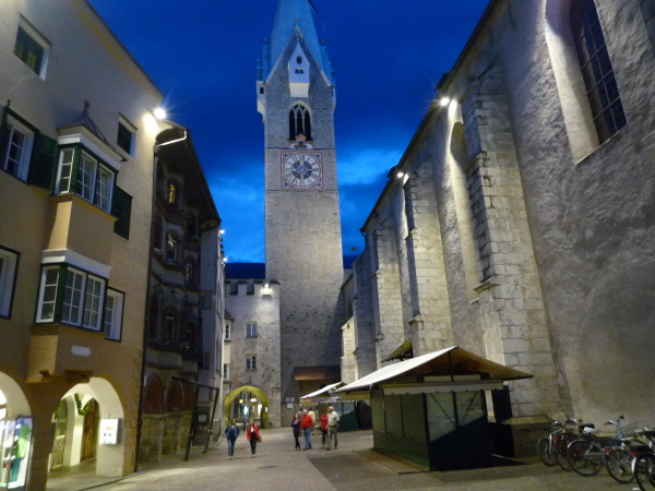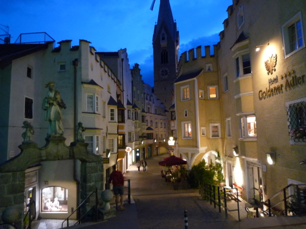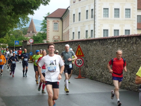 Um 7:30 Uhr hat der Morgenspuk auf der Piazza Duomo ein jähes Ende. Keine Minute nach dem Startschuss ist der Platz leergefegt, dafür füllen sich die morgenstillen Gassen der Altstadt mit dem Getrappel der Laufschuhe. Mit einer flachen Sightseeing-Schleife durch das Centro storico werden wir schonend auf Betriebstemperatur gebracht. Vorbei an der fürstbischöflichen Hofburg geht es ein Stück weit hinaus aus dem Zentrum und, nach 2,5 km beim Sportpark Süd auf die Eisack treffend, dessen grünem Ufersaum folgend dorthin zurück. Hinein in die zentrale Altstadt gelangen wir jedoch nicht mehr, denn dort, wo sich in dschungeliges Dickicht eingebettet Rienz und Eisack vereinigen, queren wir den Fluss. Kurz darauf, nach gut 4 km, ist der Stadt- und Talrand erreicht. Und das bedeutet ganz plötzlich: Bäume statt Häuser, Naturweg statt Asphalt, aber vor allem: Steil statt flach.