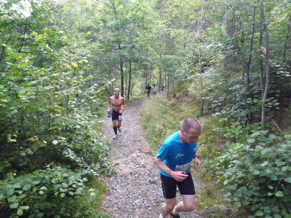 Aus den Augen, aus dem Sinn. Von Brixen ist nichts mehr zu sehen und in dichten Wald gehüllt dürfen wir uns voll und ganz auf die ersten Steigungen konzentrieren. Nur das Keuchen und Schnaufen und das Scharren der Schuhe stört die Waldesruh. Nun ja, ich will nicht übertreiben. Der lauschige Waldpfad flacht nach kurzer Zeit schon wieder ab und lädt, parallel zum Tal führend, nochmals zum Galopp über Stock und Stein ein. Bei km 6 ist aber dann definitiv Schluss mit easy going. Angesichts der Steigungen entschließt sich die Mehrheit schnell zu kollektivem Kolonnenwandern.