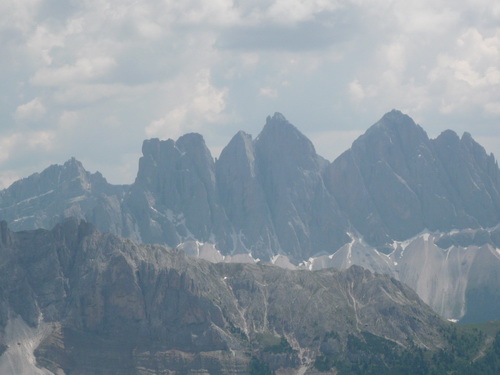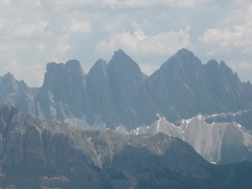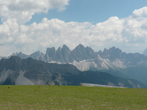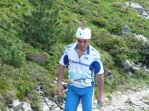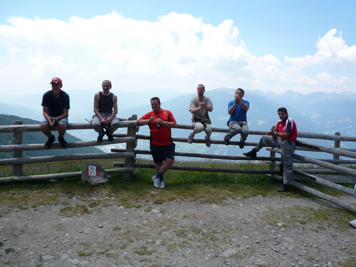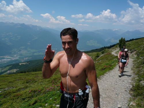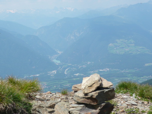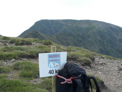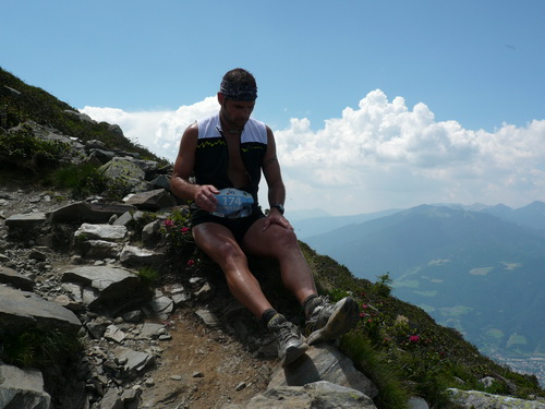Dann wird es übel. Wir haben zwar einen klasse Ausblick auf Brixen, aber zum Schauen müsste man stehen bleiben. Es geht sausteil hoch zur Plosescharte (2220 Meter) und zum Leonharter Kreuz (2365 Meter). Die Zeit läuft davon und der Schweiß in Strömen. Einer sitzt am Rand mit einem Muskelkrampf. Ich sehe die selbst arbeitenden Muskeln bei dem bedauernswerter Läufer. Weiter.