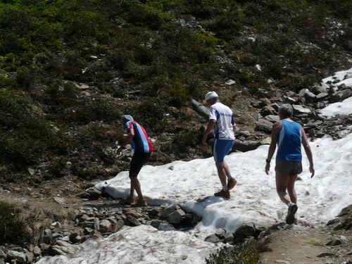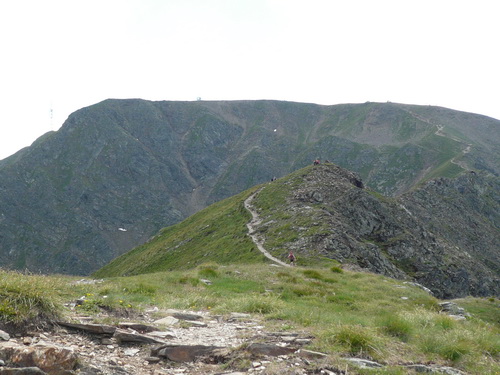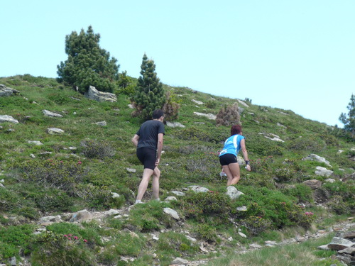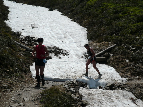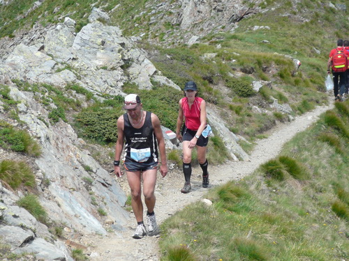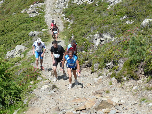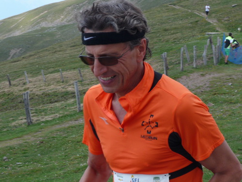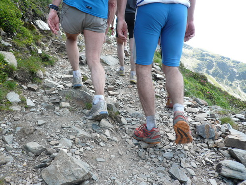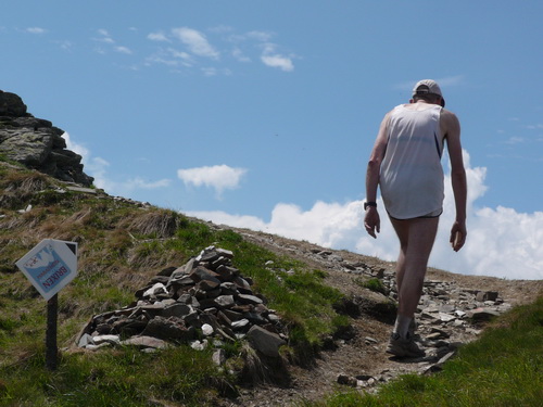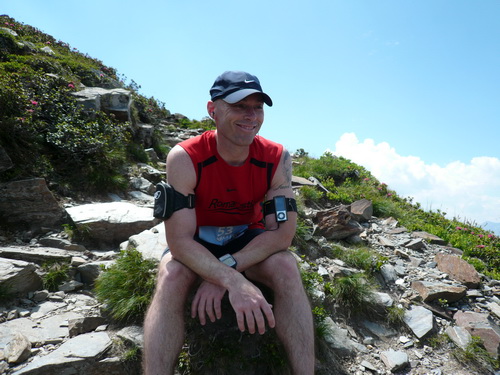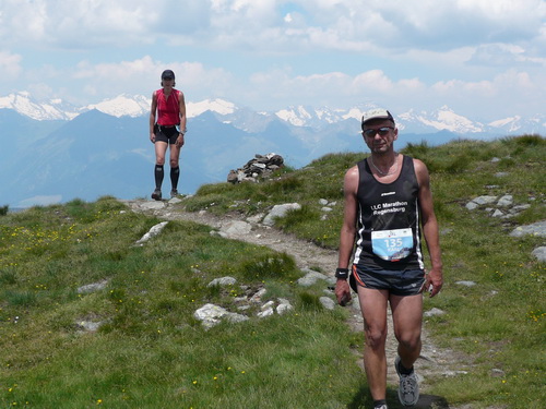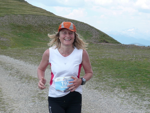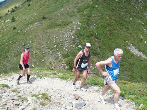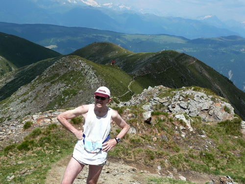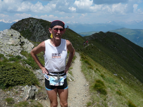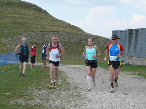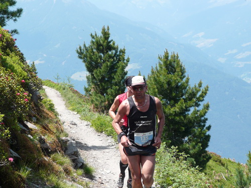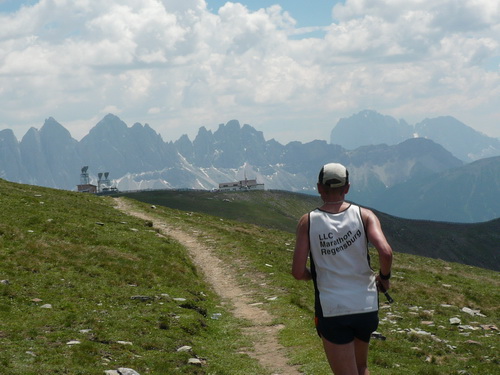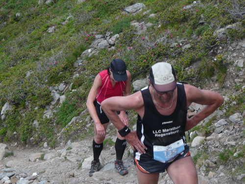 Silvia hat schwarzen Humor, als sie einen Rückstand wieder einholt. „Das würde euch so passen, dass ihr die Alte abhängen könntet.“ Das ärgste Steilstück, wo ich jeden Tritt vorher fixiere, lässt nach. Nun folgt ein Gratweg mit mehreren kleinen, kurzen Rampen zum Telegraph (2486 Meter). Die Strecke wir hier gut von der Bergrettung überwacht. Die Helfer sitzen auf jeder kleinen Anhöhe. Einer lässt bei meinem Vorbeilaufen sogar einen Jodler los.