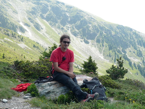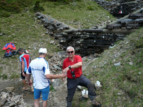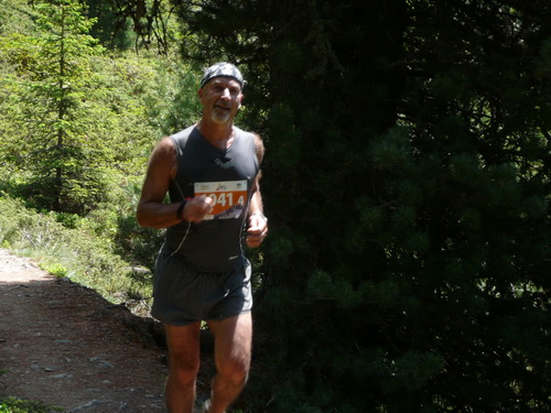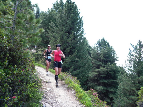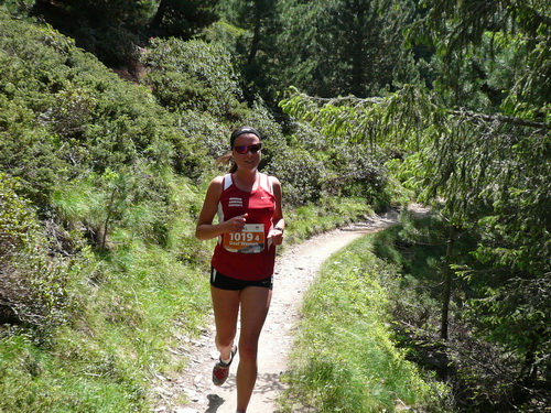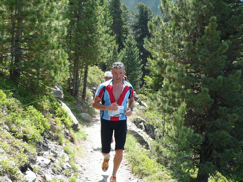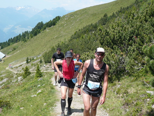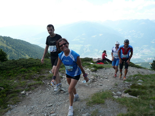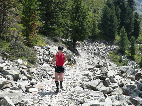 Wir verlieren wieder viele Höhenmeter, bevor uns ein Wegweiser nach links laufen lässt. Wieder eine V-Stelle. Hier ist „Saufen“ angesagt, denn es kommt eine Rampe mit rund 350 Höhenmeter, die uns aus dem Aferer Tal herausbringt. Viele Läufer werden hier langsamer, einige stehen bereits oder sitzen. Wir können einige hinter uns lassen.