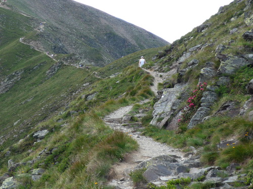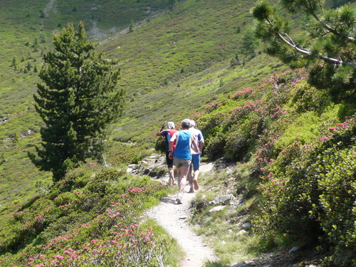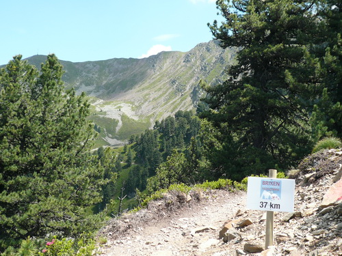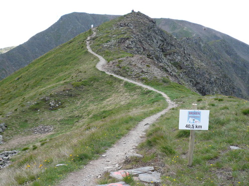Ab jetzt sind alle 500 Meter ausgeschildert. Eine wertvolle Hilfe. Zunächst geht es mit wenig Höhengewinn bis Kilometer 39 zur Ochsenalm (2085 Meter). Der alpine Steig entpuppt sich als gemütliche Bergwanderweg.