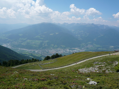 An der Peitlerknappenhütte (1970 Meter) wird unser Kurs wieder gefälliger. Es geht nun Richtung Bergstation der Plosebahn. Waldwege, Wiesentrails und befestigte Naturstraßen, so abwechslungsreich ist der Laufkurs.