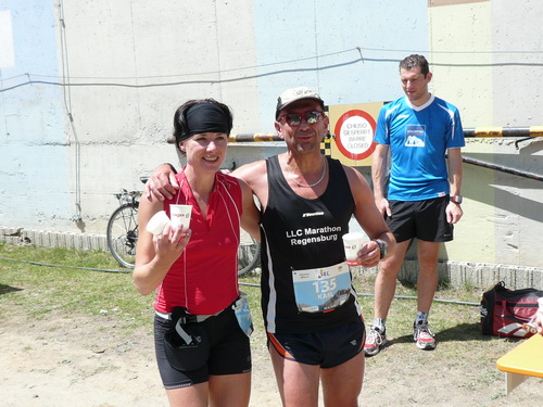 Dann sehe ich einen Laufkollegen, der sich eine Deutschlandfahne umgebunden hat. „Du bringst ja deine überschüssige Wärme da nicht weg,“ so ein Fingerzeig von mir. Er schaut fragend. „Mir würde da jetzt das A…Wasser kochen,“ so meine Antwort. Lautes brüllendes Lachen folgt.