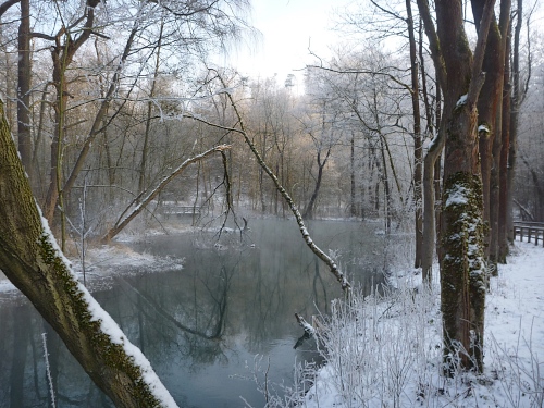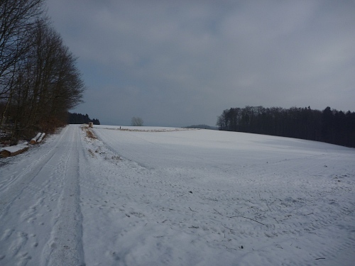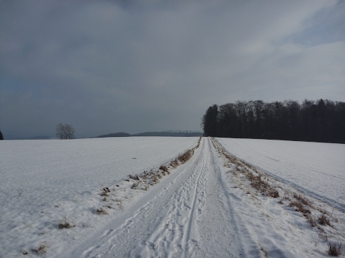 Der Seeburger See, nächste Verpflegungssation bei km 16. Orangensaft mit heissem Wasser in meine Thermosflasche. Der See, falls er unter der Eislandschaft zu sehen wäre, ist nur 3,5 Meter tief. Unter dem See lag ein Steinsalzlager, welches sich vor etwa 2500 Jahren auflöste und durch Nachsacken diesen See bildete.Die ganze Gegend weist Erdfälle und gefährliche Tiefen auf. Die Brüder Grimm erzählen in der Sage vom Grafen Isang, wie ein Schloss hier in der Erde verschwandt. Tatsächlich fand man im See Steine und Eichenbohlen, sowie einige Silbergefäße. Und die Altarstühle in Berenshausen sollen die Schenkung des Grafen sein.