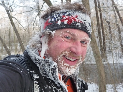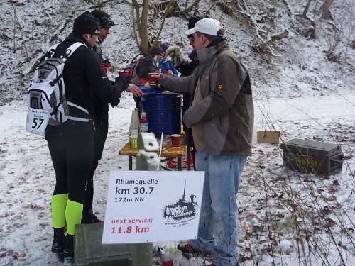 Landolfshausen km 11, die erste Verpflegungsstation. Das Sterbehospiz, einer der Spendenempfänger, kocht Tee, guten Tee, keinen künstlichen. Kamillentee. Es ist keine Zeit zum Sterben, für uns nicht, auch wenn ich total tiefgefroren bin und mir die Eiskristalle an den Wimpern kleben. Zum Glück habe ich ein zweites Paar Handschuhe, also drüber damit. Essen kann ich immer noch nichts, das könnte noch gefärlich werden.